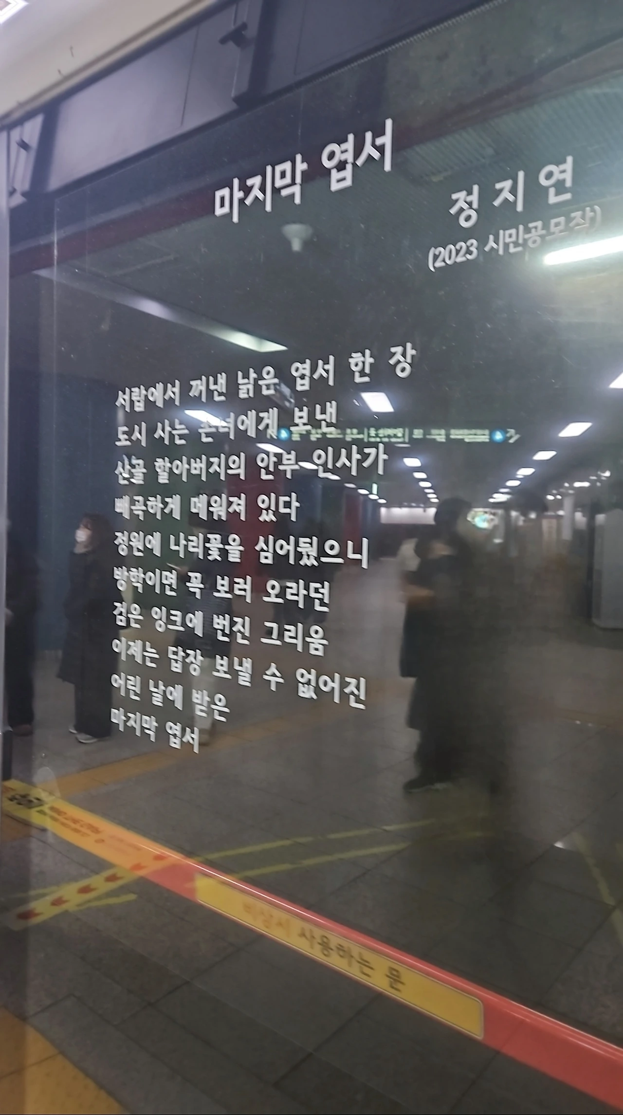 얼마 전 지하철 3호선을 기다리고 있었다. 지하철 승강장 안전 문에 적힌 한 시민의 시를 무심코 읽다 참을 새도 없이 눈물을 흘리고 말았다. 소박하고 평범한 글을 읽어나가다 마지막 구절에 나도 모르게 참고 있었던 그리움의 둑이 열려버린 거 같다.