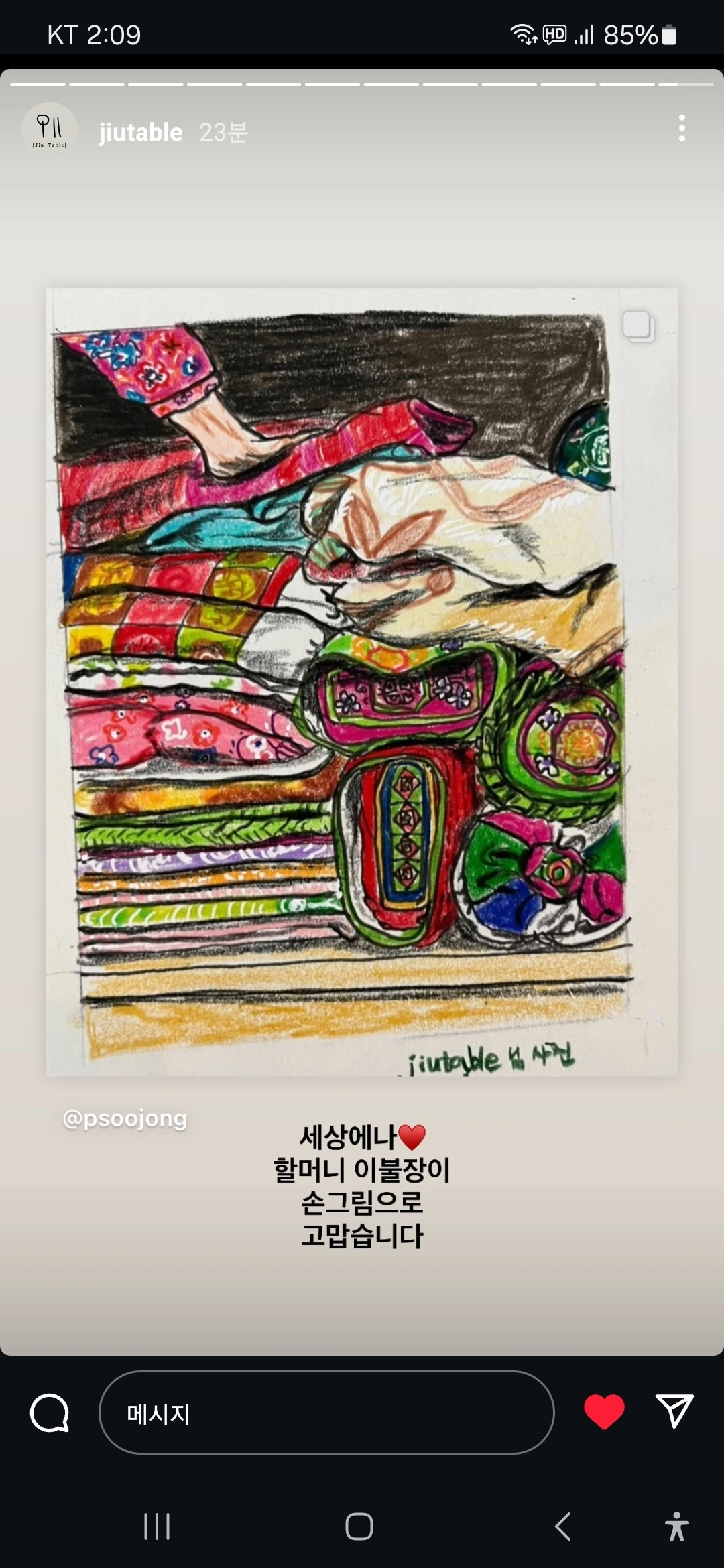 그냥 그림만 그리는 건 자유지만 인스타에 올리고 싶었기에 jiu님에게 허락을 구하는 메시지를 보냈다. 허락을 기대하고는 있었지만 사적인 이불장 사진이기에 싫다고 해도 어쩔 수 없는 일이었다.