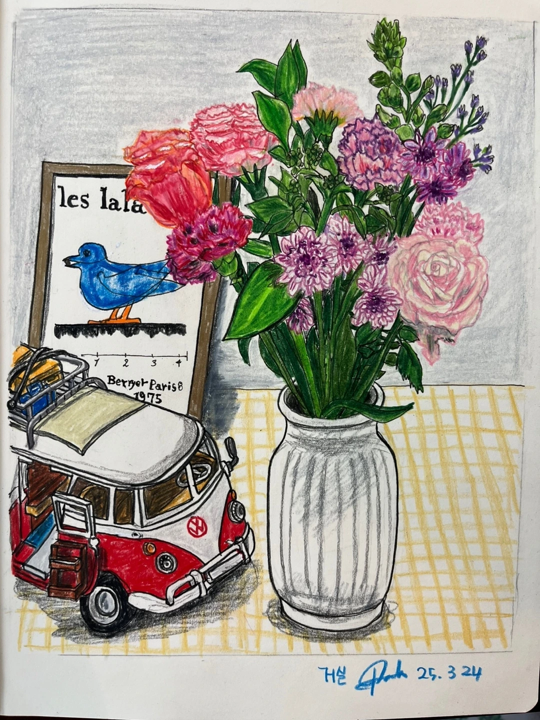 밖에 나오진 못했어도 꽃을 보고 싶은 마음에 작년에 찍어두었던 꽃 사진을 연달아 그렸다. 실제로 보는 것도 아닌데 색이 고운 예쁜 꽃들을 그리자 마음만은 화사해졌다. 실제 꽃 못지않게 기분이 좋았다.