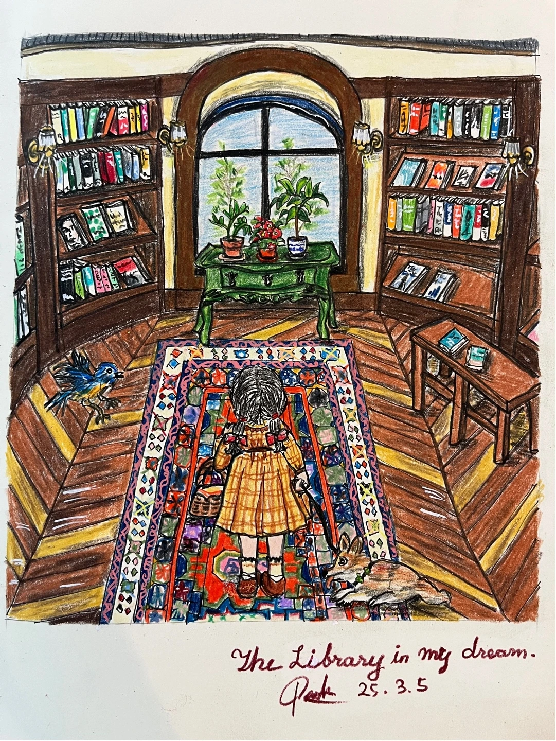 저번 글에서 아직 스케치만 했던 또 다른 상상화도 완성했다. 꿈에 그리는 유럽풍의 도서관이다. 상상으로 그려 뭔가 어설프고 이상하기도 하지만 어린 소녀가 좋아하는 강아지와 파랑새와 함께 멋진 도서관에 있는 장면은 오랜 상상 속 이미지다. 유럽도 아니고 세상 어디에도 없는 도서관에 있는 어린 내 모습을 구현해 냈다는 게 벅차다.