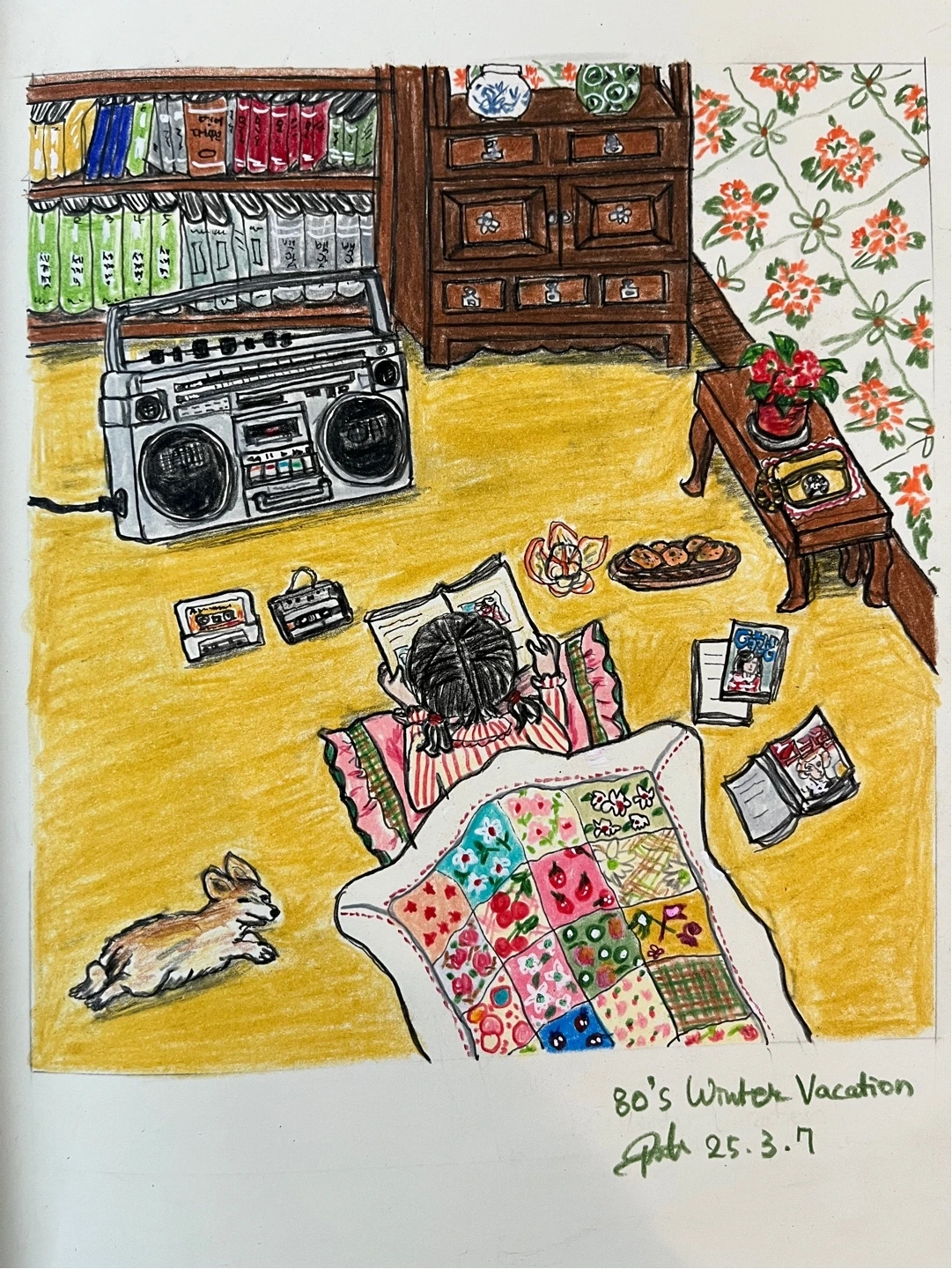 그 카세트플레이어를 보는 순간 그 시절 벅차던 마음과 장면들이 떠올라 그림으로 그렸다. 누런색 장판이 깔린 방에서 엄마가 깨끗하게 시친 이불을 덮고 하루 종일 음악을 들으며 꿈속에서 살던 10대 시절 그림이다.