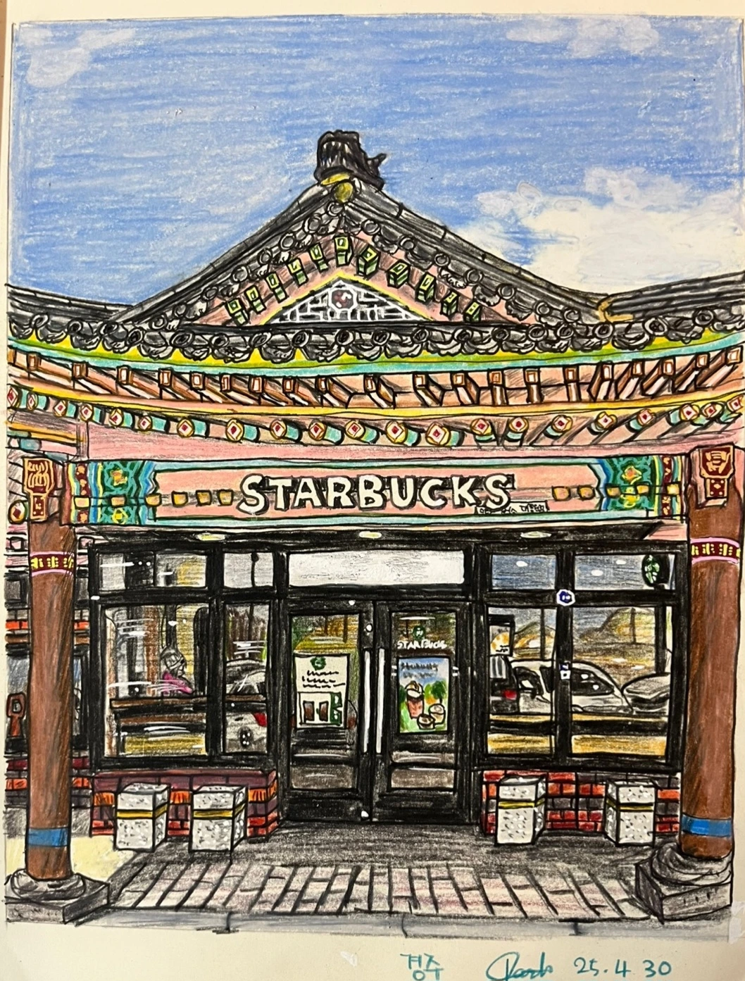 그렇게 좋았던 여행이라 사진을 자주 찾아본다. 특히 색감이 예쁜 사진은 그리고 싶은 욕구를 마구 일으켜 여러 장 그렸다. 가장 최근에 그린 그림은 스타벅스 대릉원점이다. 첨성대 근처에 있는 스타벅스로 경주의 느낌을 살려 만들어졌다.
