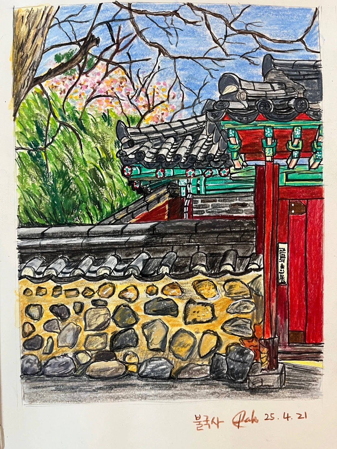 경주의 고즈넉하고 조용한 풍경에 어울리는 공들여 만든 기와지붕과 단청이 예쁘다. 장식이 많고 단청의 색이 복잡해 그릴 엄두가 나지 않아 몇 날 며칠 째려보기만 하다 결심을 하고 그리기 시작했다. 장식 하나에도 손이 정말 많이 갔다. 그래도 그 과정 하나하나 명상하듯 집중하는 기분이 좋았다.