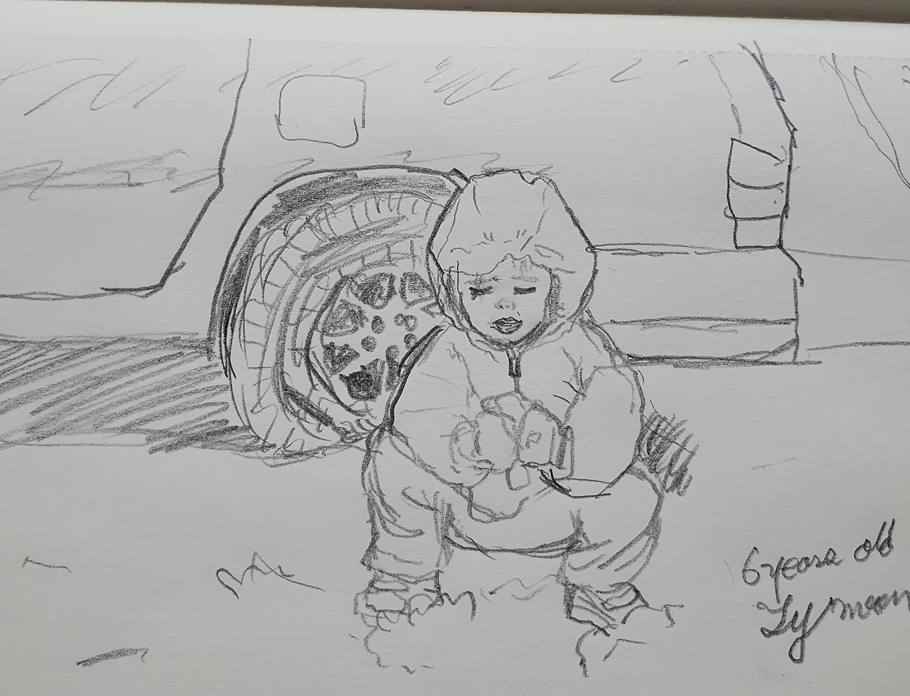 눈이 온 날 큰 애가 집앞에서 놀던 모습을 그렸다