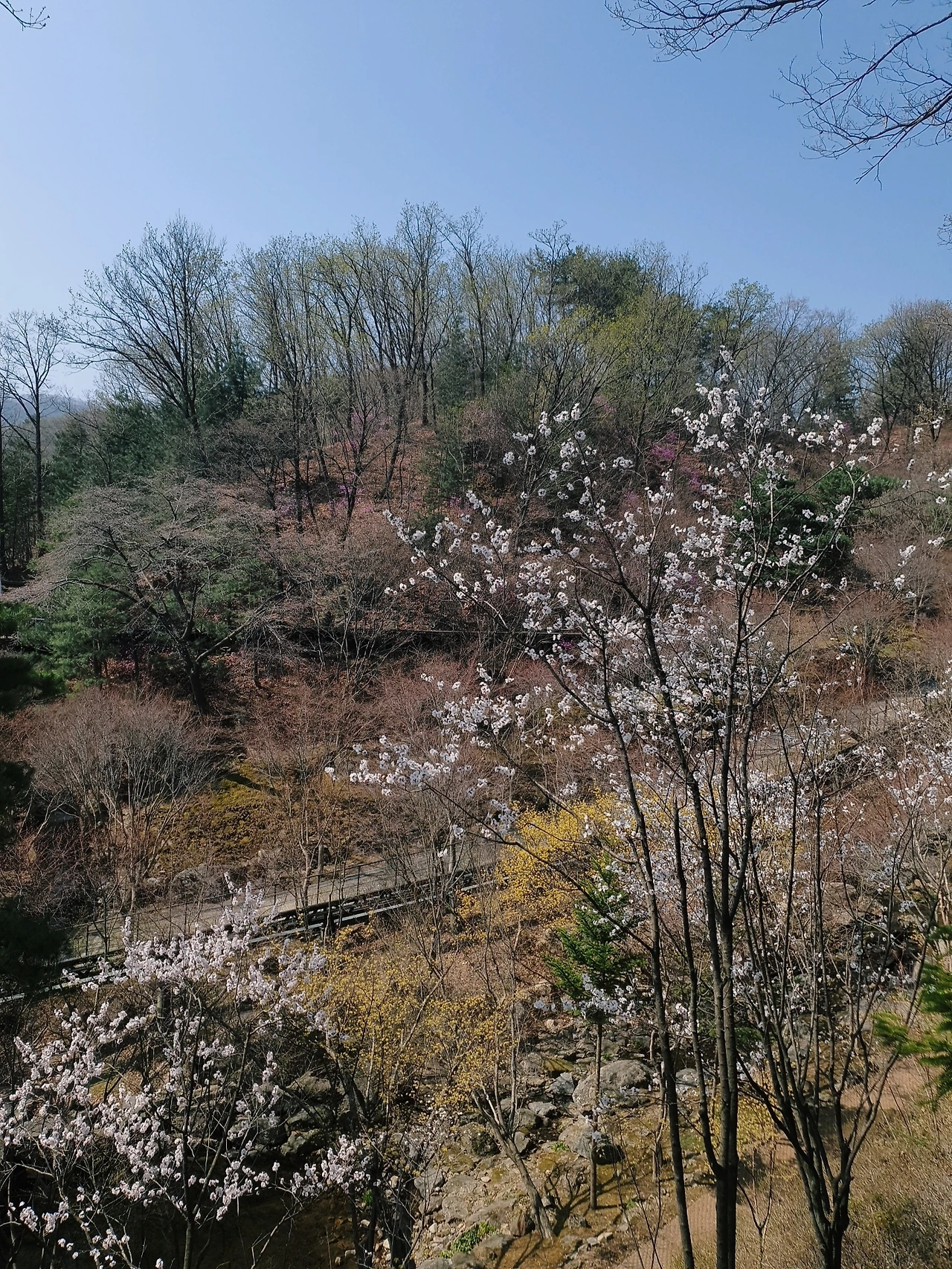 올라가는 길이 진달래 영역, 수선화 영역, 자작나무 영역 이런 식으로 관리되어 있었다. 남편과 나는 저질 체력이라 꼭대기에 있는 자작나무까지는 가지 못했지만 한창 절정에 있는 진달래와 수선화를 실컷 봤다. 숲 속 가득 피어있는 꽃을 보며 어딘가 다른 차원에 머무는 듯한 황홀한 느낌이 들었다. 이래서 사람들이 일부러 시간을 내고 힘들어도 꽃을 보러 다니는구나 라는 생각이 들었다.