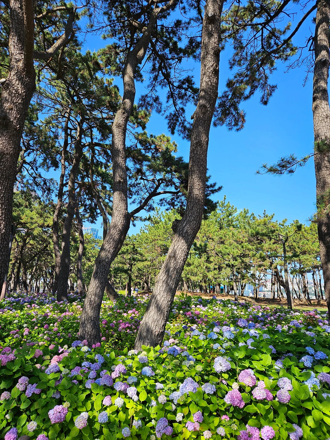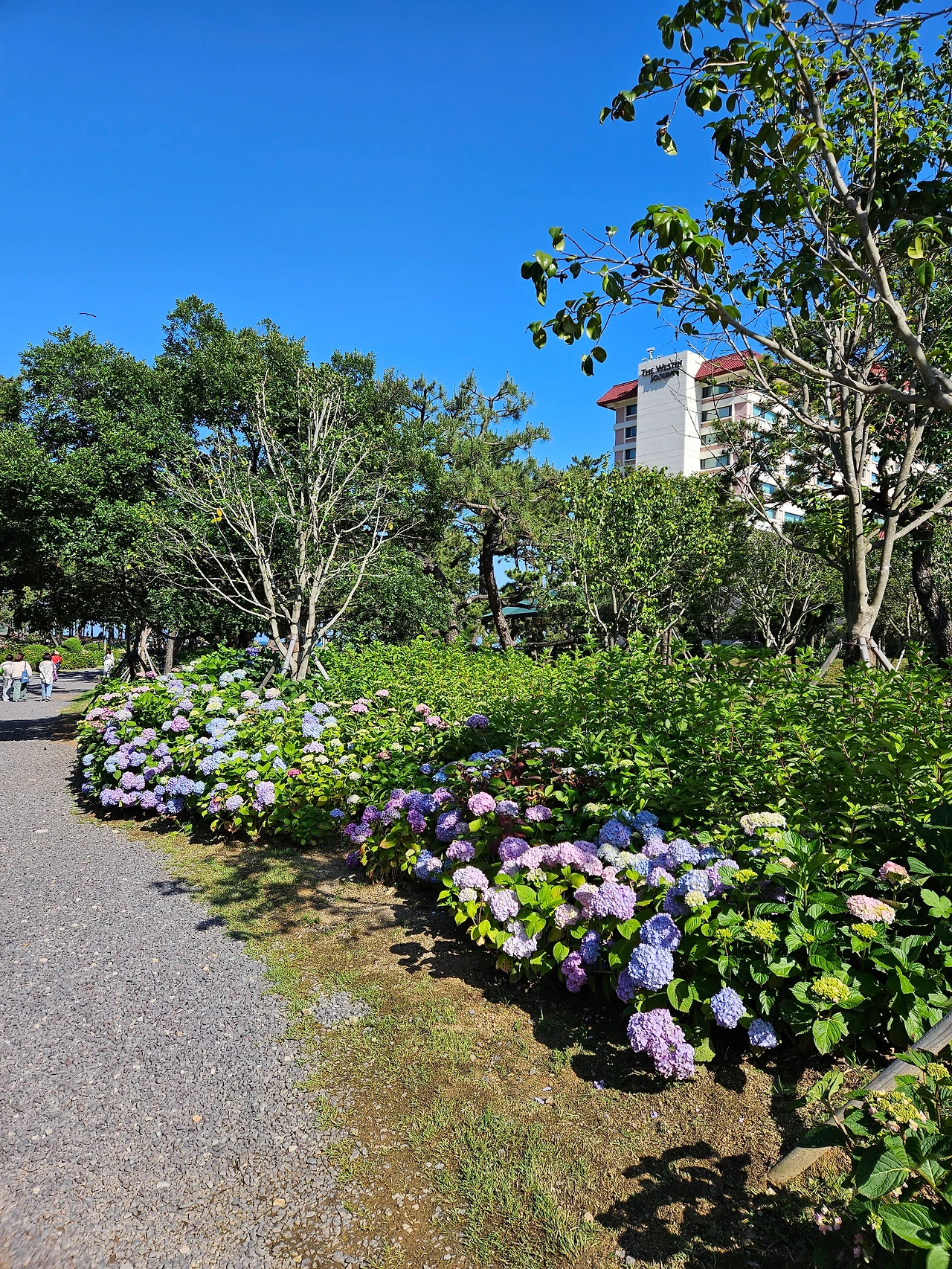 여유롭게 둘러보고 오늘 묵을 호텔이 있는 해운대로 갈 광역버스를 탔다. 1시간 조금 넘는 시간이 걸렸다. 버스에서 내려 지도를 보고 호텔을 찾아가는데 호텔 옆에 너무도 아름다운 수국꽃밭이 펼쳐져 있었다. 그동안 3-4번 부산에 왔었지만 늘 한여름이나 한겨울 아이들 방학 때에만 여행을 다녀 이렇게 아름다운 꽃을 본 건 처음이었다. 감탄을 금치 못할 장관이 펼쳐져 있었다. 이 수국들의 향연이 바다보다 더 오래도록 기억에 남을 것 같다.