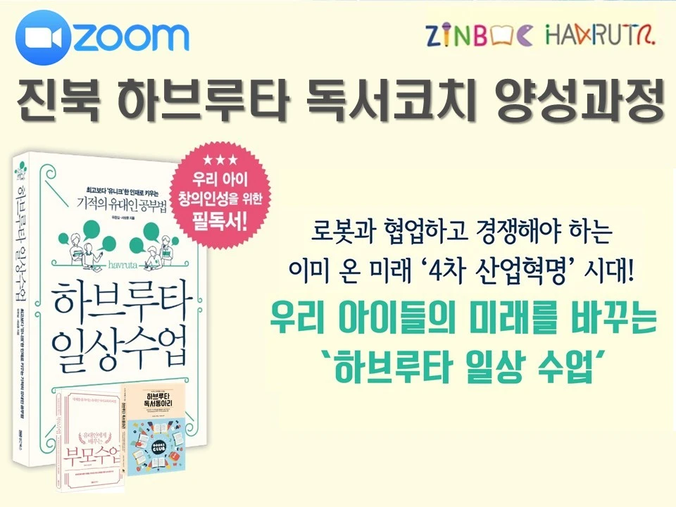 한국형 진북 하브루타의 엑기스를 담은 <하브루타 일상수업>과 <유대인 부모수업>, <누구나 따라할 수 있는 하브루타 독서동아리>의 핵심콘텐츠를 담은 ‘진북 하브루타 독서코치 양성과정’을 줌(Zoom)으로 진행합니다.