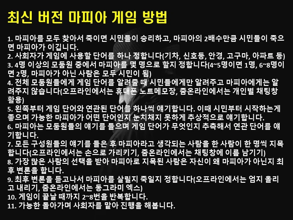 1. 마피아를 모두 찾아서 죽이면 시민들이 승리하고, 마피아의 2배수만큼 시민들이 죽으면 마피아가 이깁니다. 2. 사회자가 게임에 사용할 단어를 하나 정합니다(기차, 신호등, 안경, 고구마, 아파트 등) 3. 4명 이상의 모둠원 중에서 마피아를 몇 명으로 할지 정합니다(4~5명이면 1명, 6~8명이면 2명, 마피아가 아닌 사람은 모두 시민이 됨) 4. 전체 모둠원들에게 게임 단어를 알려줄 때 시민들에게만 알려주고 마피아에게는 알려주지 않습니다(오프라인에서는 휴대폰 노트메모장, 줌온라인에서는 개인별 채팅창 활용) 5. 왼쪽부터 게임 단어와 연관된 단어를 하나씩 얘기합니다. 이때 시민부터 시작하는게 좋으며 가능한 마피아가 어떤 단어인지 눈치채지 못하게 추상적으로 얘기합니다. 6. 마피아는 모둠원들의 얘기를 들으며 게임 단어가 무엇인지 추측해서 연관 단어를 얘기합니다. 7. 모든 구성원들의 얘기를 들은 후 마피아라고 생각되는 사람을 한 사람이 한 명씩 지목합니다(오프라인에서는 손으로 가리키기, 줌온라인에서는 채팅창에 이름 남기기) 8. 가장 많은 사람의 선택을 받아 마피아로 지목된 사람은 자신이 왜 마피아가 아닌지 최후 변론을 합니다. 9. 최후 변론을 듣고나서 마피아를 살릴지 죽일지 정합니다(오프라인에서는 엄지 올리고 내리기, 줌온라인에서는 동그라미 엑스) 10. 게임이 끝날 때까지 2~8번을 반복합니다. 11. 가능한 돌아가며 사회자를 맡아 진행을 해봅니다.