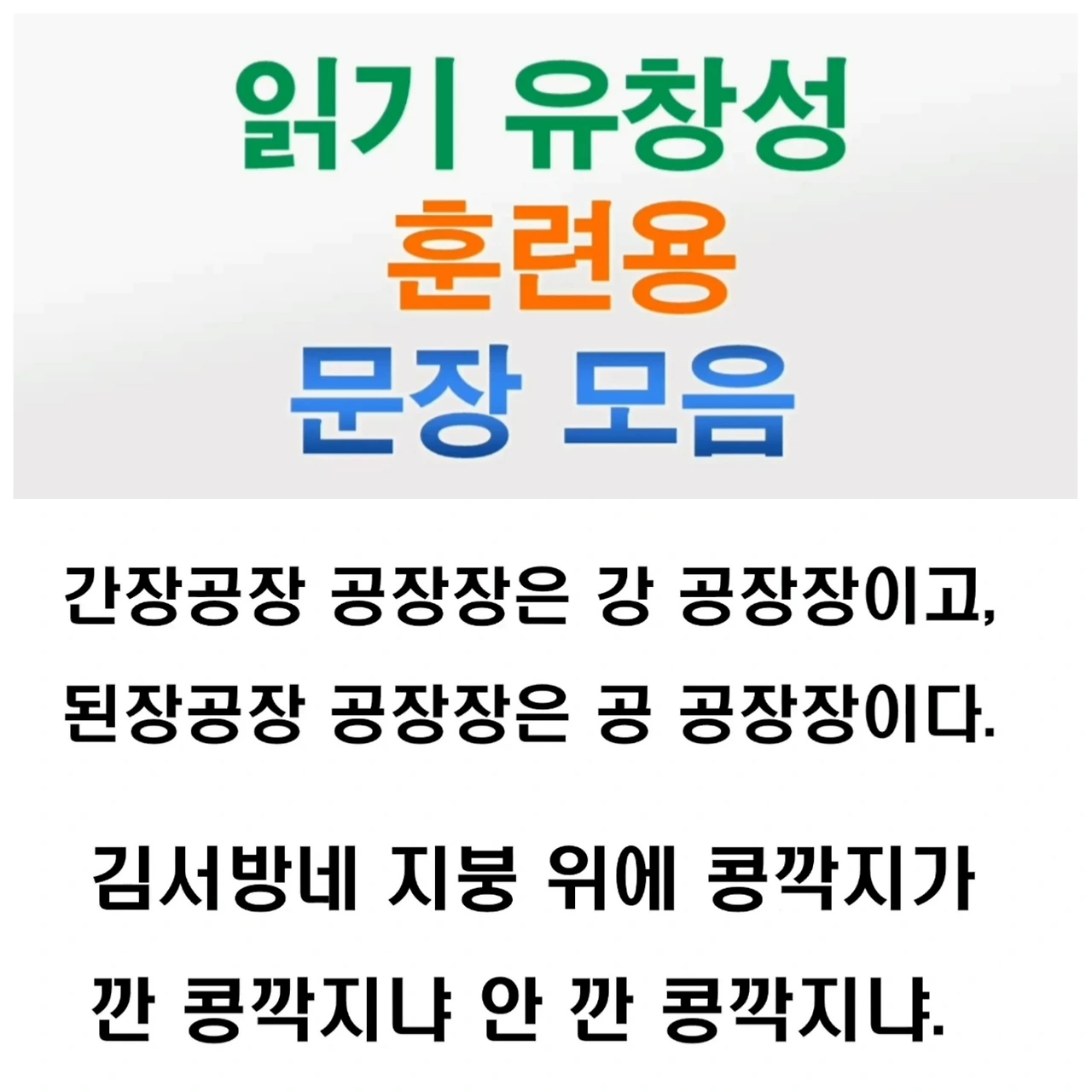 “간장공장 공장장은 강 공장장이고, 된장공장 공장장은 공 공장장이다.”, “김서방네 지붕 위에 콩깍지가 깐 콩깍지냐 안 깐 콩깍지냐.”, “저 분은 백 법학박사이시고, 이 분은 박 법학박사이시다.”, “한양 양장점 옆 한영 양장점, 한영 양장점 옆 한양 양장점.”, “경찰청 철창살은 외철창살이냐 쌍철창살이냐, 쇠철창살이냐 철철창살이냐.”
