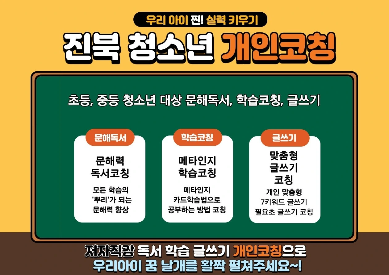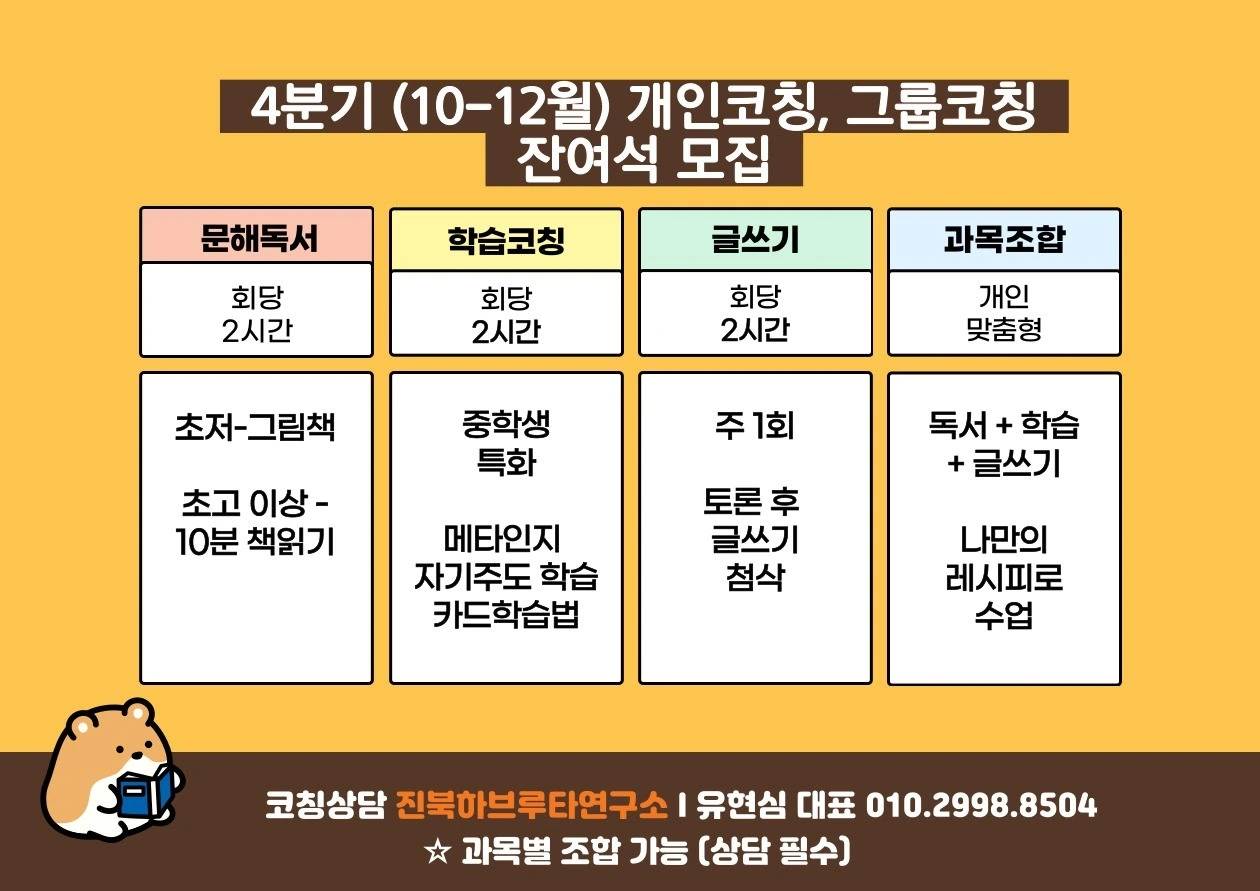 개인 맞춤형 코칭으로 ‘문해력 독서코칭’, ‘메타인지 학습코칭’, '맞춤형 글쓰기 코칭' 중 어느 한 가지 주제에 집중할 수도 있고, 2개 이상의 주제로 조합하여 선택할 수도 있습니다.