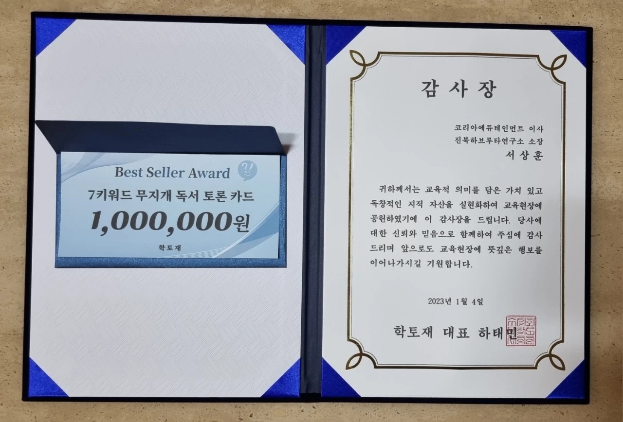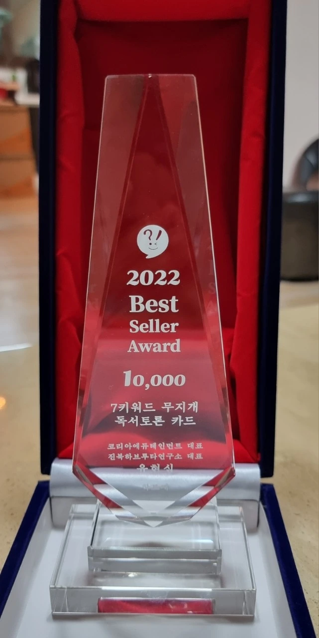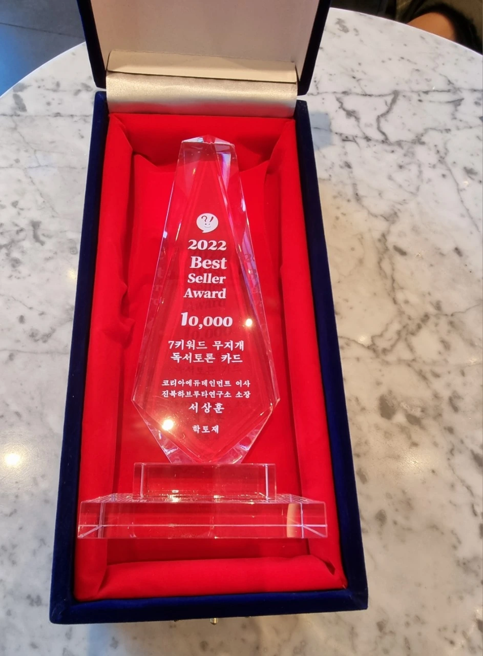 새해 시작과 함께 깜짝 선물을 받게 되었네요~ 하브루타와 메타인지로 미래교육을 선도하는 <진북하브루타연구소>가 만든 '7키워드 무지개 독서토론 카드'가 10,000개 판매를 돌파해서 학토재 베스트셀러상(학토재 Best seller Award 10,000)을 수상했습니다~