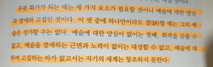 어찌 화가뿐이겠는가. 학문도, 사랑도, 인생살이도 그러하다. ‘양심, 열애, 고집’이 없는 자가 무슨 학문을 하겠는가. 사랑은 저 세 가지야말로 필요충분조건이다. 인생도 그렇다. 제 인생 제가 살아내려면 제 삶에 대한 뜨거운 사랑 없이 되겠는가.