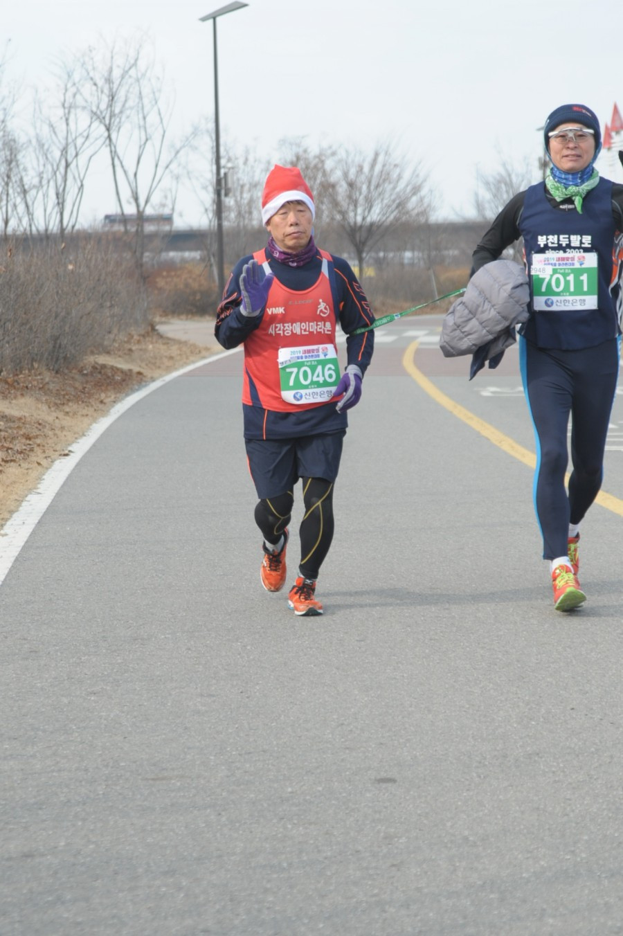 그렇게 시각장애인 분(시각장애인 마라토너 손병석 씨)과 달리기가 시작되었다. 손병석 씨는 키는 작지만 강단 있어 보였다. 발걸음도 가벼웠다. 서툰 내 페이스메이커 노릇에도 나보다 반 걸음은 더 빨리 뛰었다. 그렇게 하프 지점을 통과했다. 이미 내 몸 상태도 90%에 도달하였다. 심장은 격하게 뛰었다. 도로도 좋지 않은 데다 자전거와 행인이 오고 가기에 말을 계속 건네야 했다.