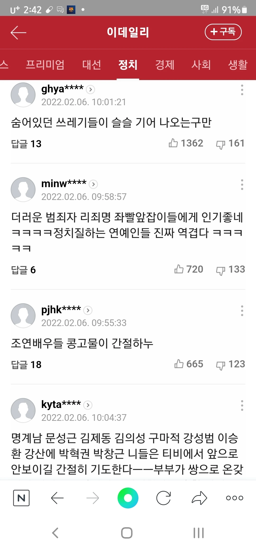 저분은 연예인이기 전에 이 나라의 국민으로서 선거권과 피선거권이 있다. 댓글을 쓴 이들이 나라를 생각하여 글을 썼듯, 저분도 국가와 민족을 위해 당당히 자기 의사를 밝힐 권리도 있다. 국민의 한 사람으로서 자기 의사 표현은 동등한 자격을 갖는다. 더욱이 대중의 인기로 삶을 이어가는 저분은 용기 내어 자기 의사를 밝혔다. 칭찬은 못 해줄망정 온갖 모욕과 욕설을 해대는 이유가 무엇일까? 남을 모욕하라 주어진 권한을 갖은 사람은 이 세상에 단 한 사람도 없다. 역으로 자기 글에 저런 댓글이 달린다 생각하면 저러할까? 실명이라면 저렇게 쓸까?