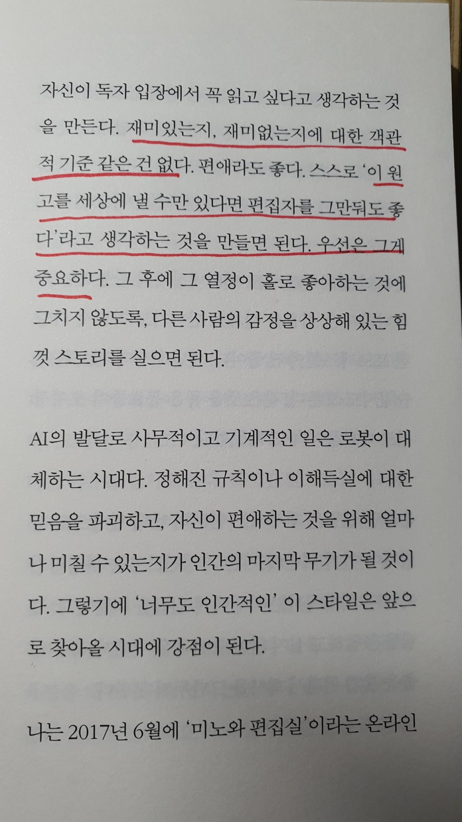 이 책을 읽으며 나도 저러한 편집장과 저러한 편집장을 이해하는 출판계를 만나보았으면 하는 생각이 든다. 미노와 책이 비즈니스라는 영역의 출판이어서 그렇다고 할 수도 있다. 하지만 내 전공인 인문학(고전문학)이라 다를 바 없다.(오히려 이 세상을 이끄는 것은 비즈니스가 아닌, 경영이 아닌, 인간으로서 우리가 갈 길을 보여주는 인문학이다.)