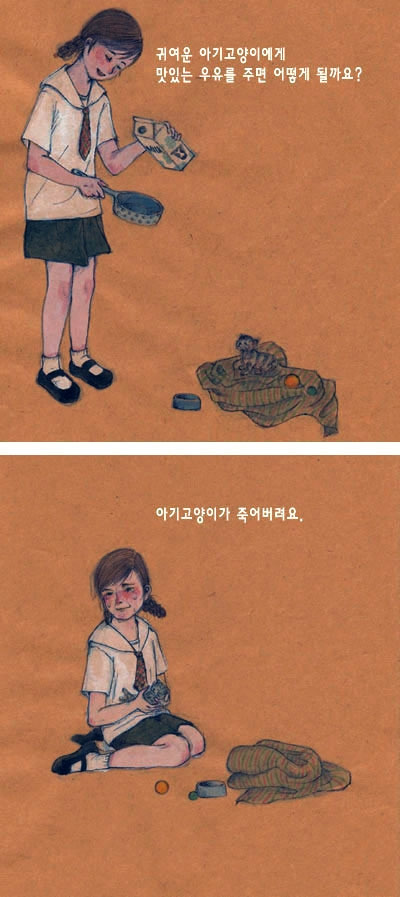아가 고양이는 일주일만에 죽었고, 우리 둘은 말없이 고양이를 땅에 묻고 돌아왔다.