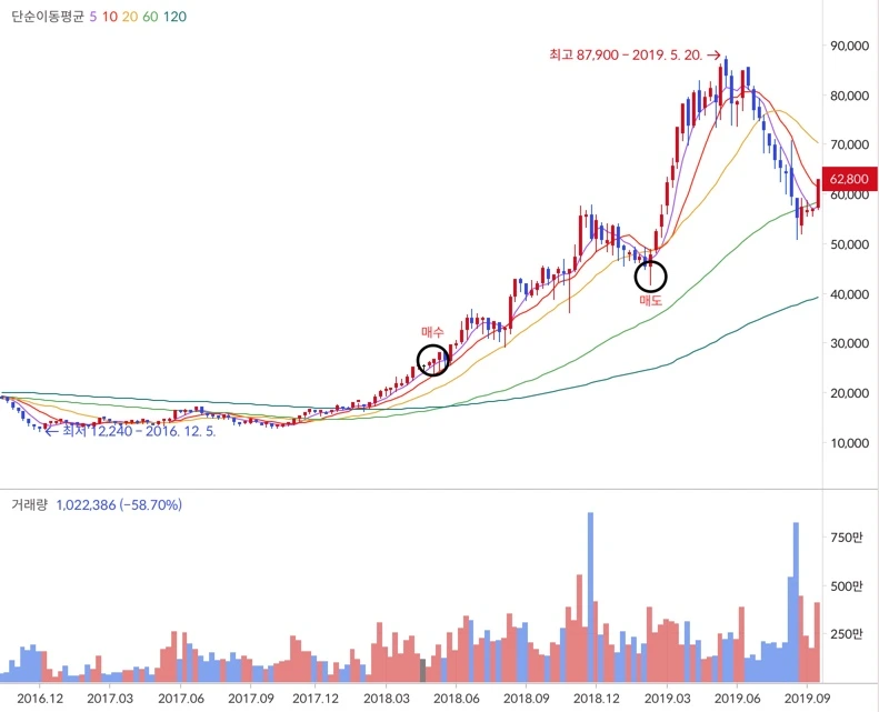 당시 주식을 매수한 시점이 아래 첫 번째 원이었다. 지금 같았으면 들어갈 수 있었을까 싶은 자리다. 이미 저점에서 상승을 시작한 지 한참 지났기 때문이다. 주린이였기 때문에 할 수 있었던 결정이라고 생각된다. 반대로 지금은 내공이 부족하기에 내릴 수 없는 결정이라고도 생각된다. 아무튼 이후 상승을 지속하다가 확 꺾이는 지점이 있었다. 그 아래꼬리에서 매도를 했다. 이 시기가 막 기술적분석을 접하던 시기였다. 5일선이 10일선을 데드크로스 하면 팔아라, 20일선은 생명선이니 20일선 이탈 시 팔아라. 그런 소리를 유튜브에서 듣고 '아, 이건 지금 팔아야 돼'라고 생각하고 팔았다. 거짓말처럼 매도하고 나서 상승 기울기가 가팔라지더니 그날 이후 두 배 이상이 올랐다.