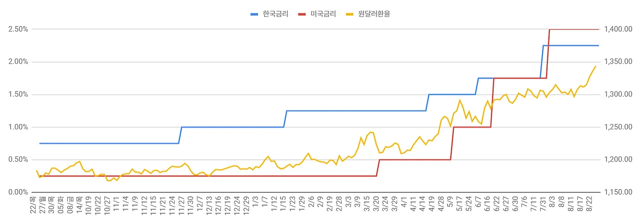 작년 10월부터 매일매일은 아니고 비 정기적으로 금리와 환율의 흐름을 모니터링하고 있었다. 그동안은 최근의 추이만을 머리로만 훑고 지나가는 정도였다. 가장 최근의 감상은 7월 말, 한국과 미국의 금리차가 역전되는 지점이었다. 그 이전에도 이미 1300원을 터치한 환율은, 미국 금리가 한국 금리를 역전하고 나서도 큰 변화가 없었다. 기준금리 차이가 점점 좁혀지는 5월 즈음부터 해서 외환보유고를 털어 그나마 환율 방어에 나선 게 아닐까 싶었는데, 아니나 다를까 통계가 외환보유고의 빠른 소진을 말해주고 있었다.