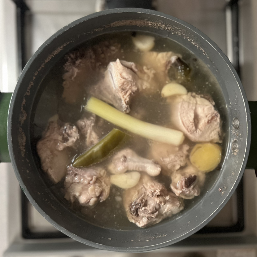 닭 육수가 나올 만큼 충분히 끓였으면, 뭉그러진 채소와 후추 등 전부 건져낸다.