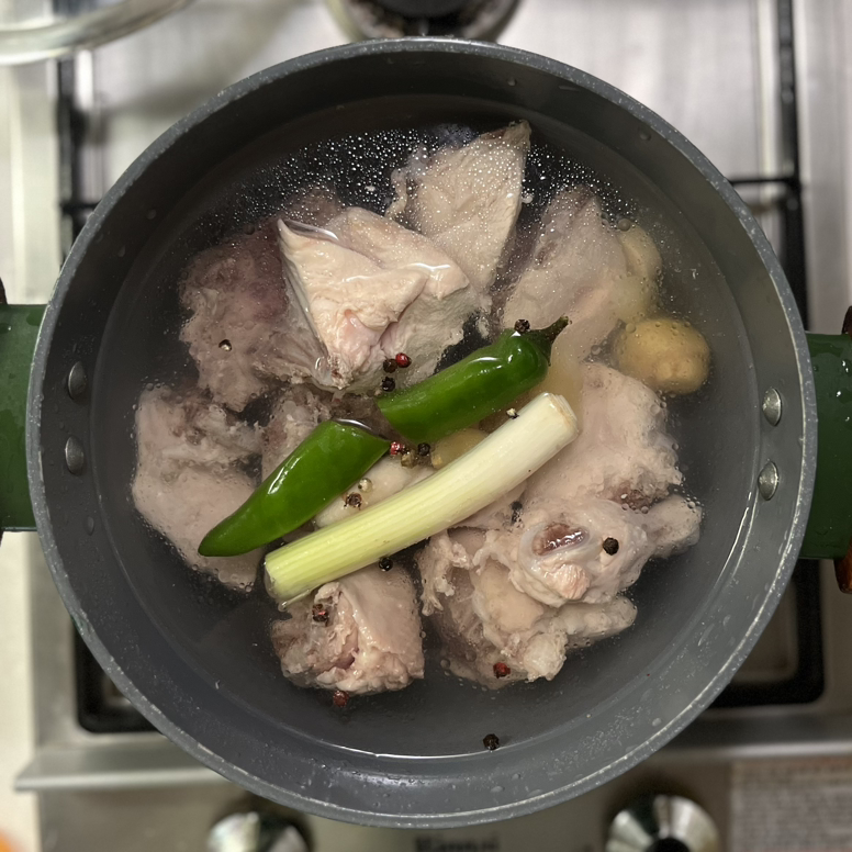 씻은 닭은 냄비에 담고, 잠길 만큼 찬물을 부은 후 끓인다.