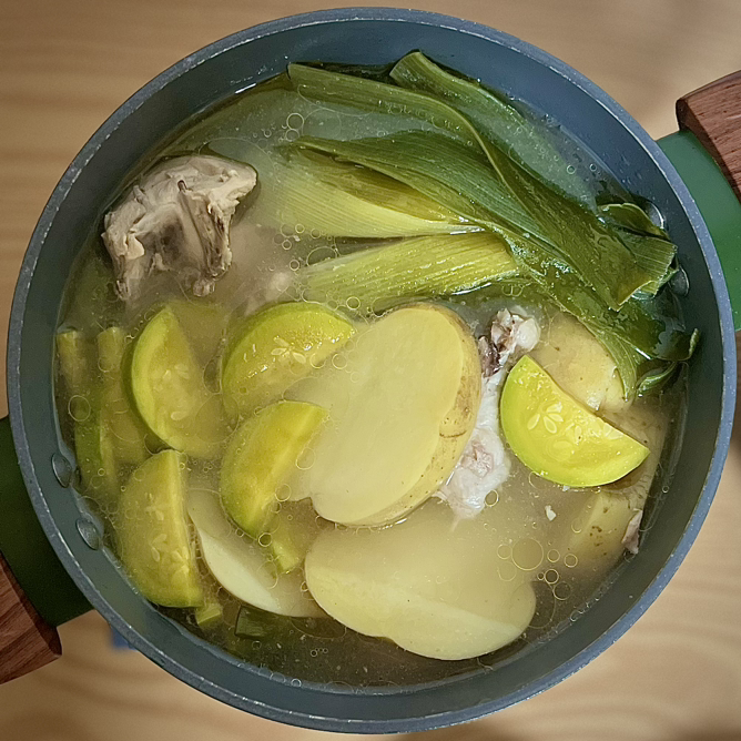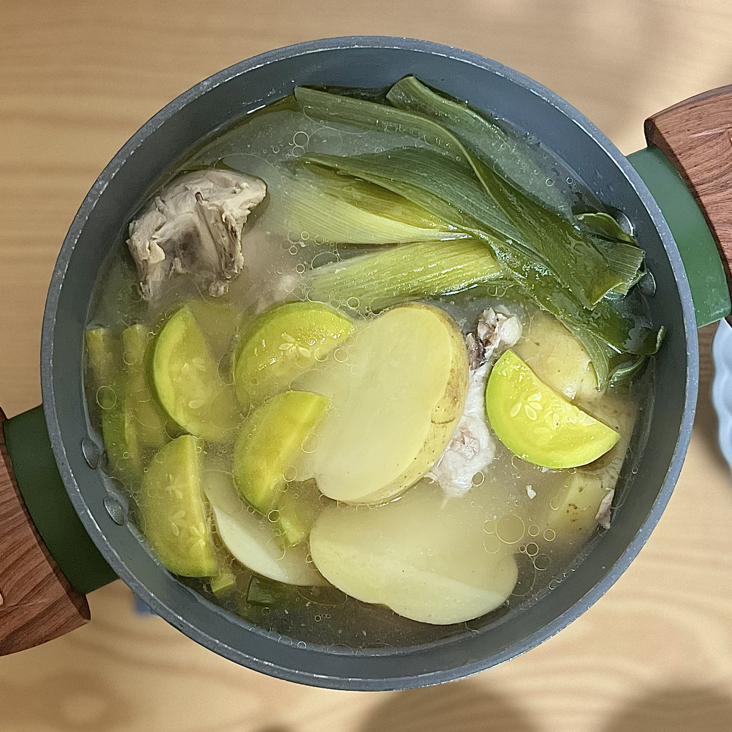 양파와 대파가 흐물흐물해지고 마늘이 뭉개질 때까지 중 약불에서 끓인다.