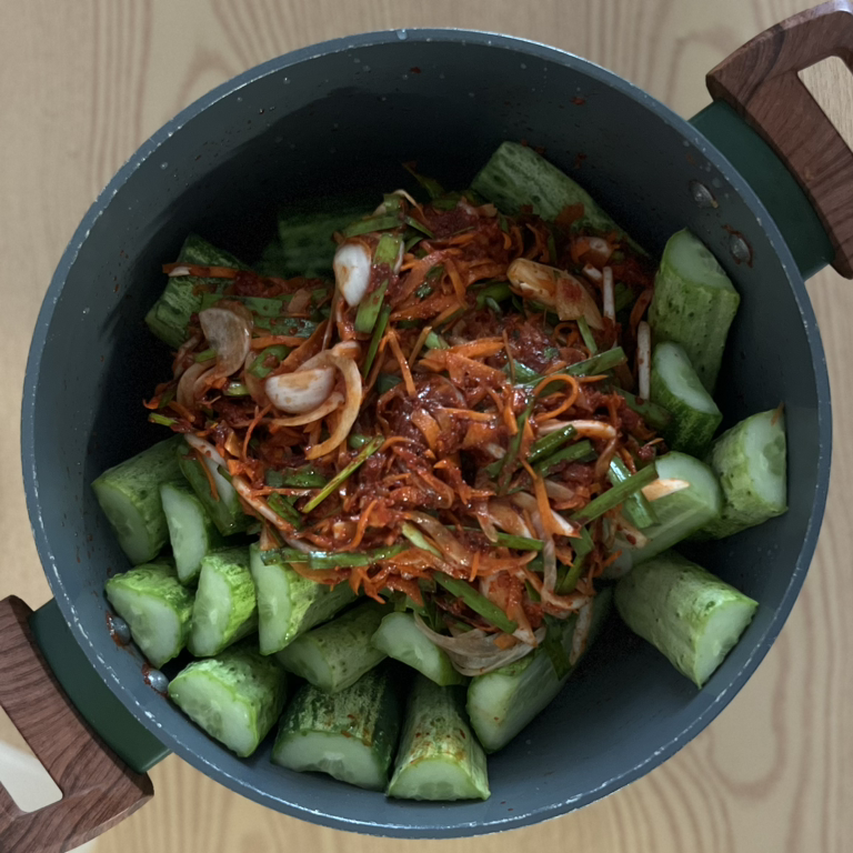 잘 버무렸으면 김치 용기에 담아 냉장보관 한다. 몇 시간만 지나도 오이나 알배추에 양념이 베어 들어서 막 만들었을 때보다 훨씬 맛있어진다!