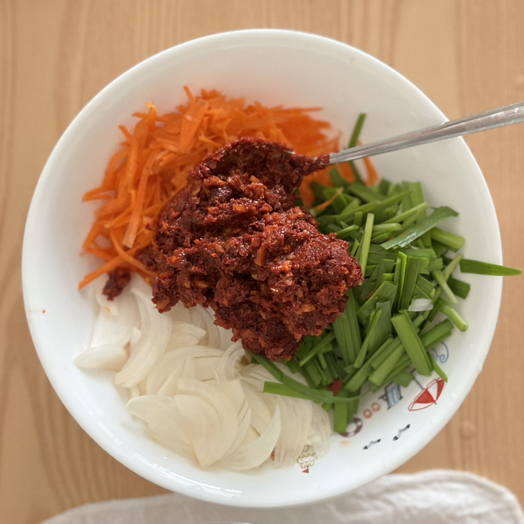 채 썬 채소와 양념장을 섞는다.