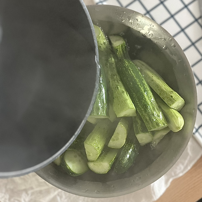 팔팔 끓는 소금물이 준비되면 손질해 놓은 오이에 그대로 붓는다.