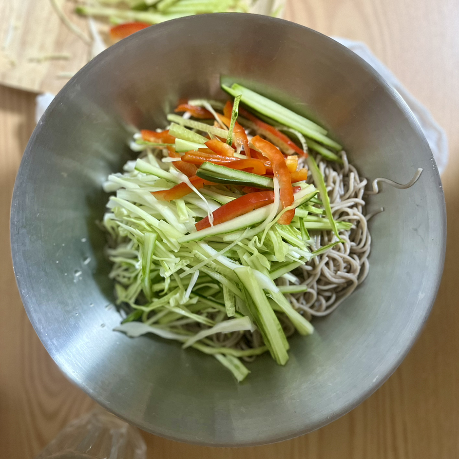 삶아진 메밀면은 찬물에 헹구고, 채소는 채친다.