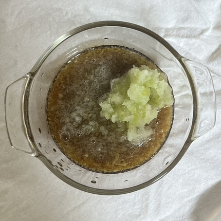 참치액 두 숟가락, 양조간장 한 숟가락, 레몬즙과 꿀(올리고당) 두 숟가락씩 섞은 다음 무를 갈아 넣는다.