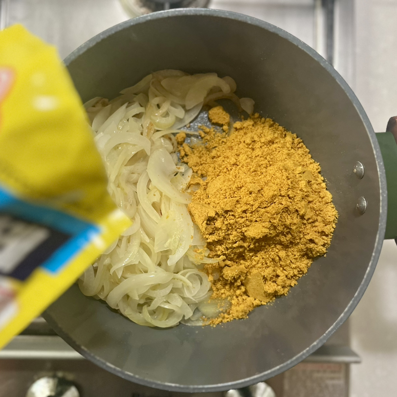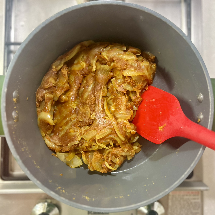 양파가 투명하고 흐물흐물해지면, 카레 가루를 넣고 같이 볶는다.