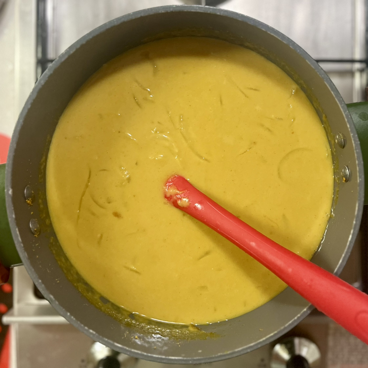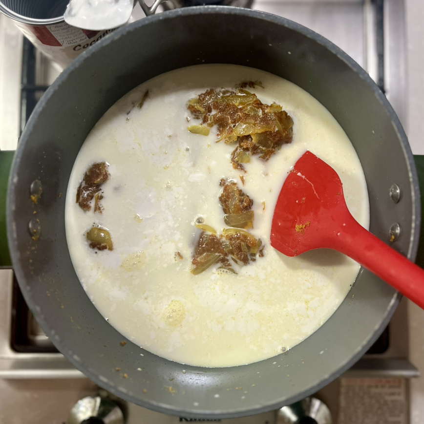 여기에 코코넛밀크 400ml 하나를 다 붓고, 카레 덩어리를 살살 풀어준다.