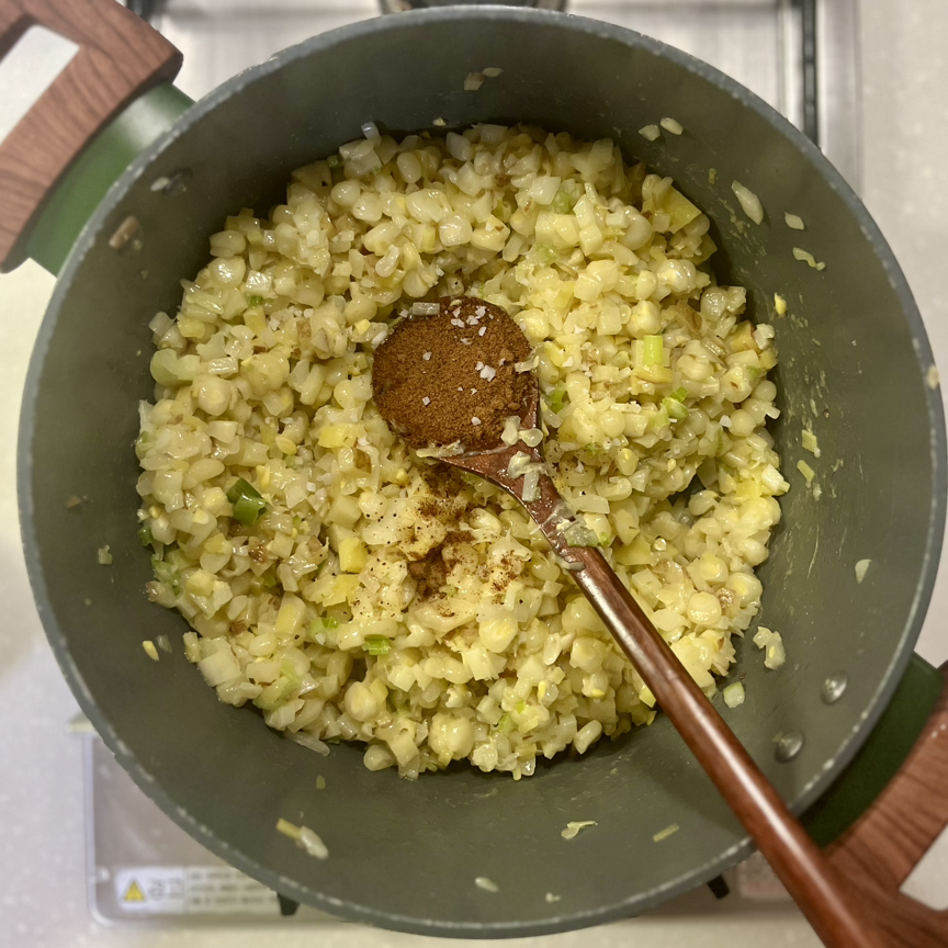 달달 볶다가 양파가 투명해지고 감자가 익으면 넛맥 1Ts 넣고 계속 볶는다.