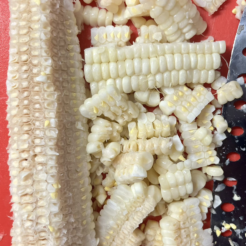 옥수수의 옆면을 칼로 잘라서 알갱이를 다 뜯어낸다.