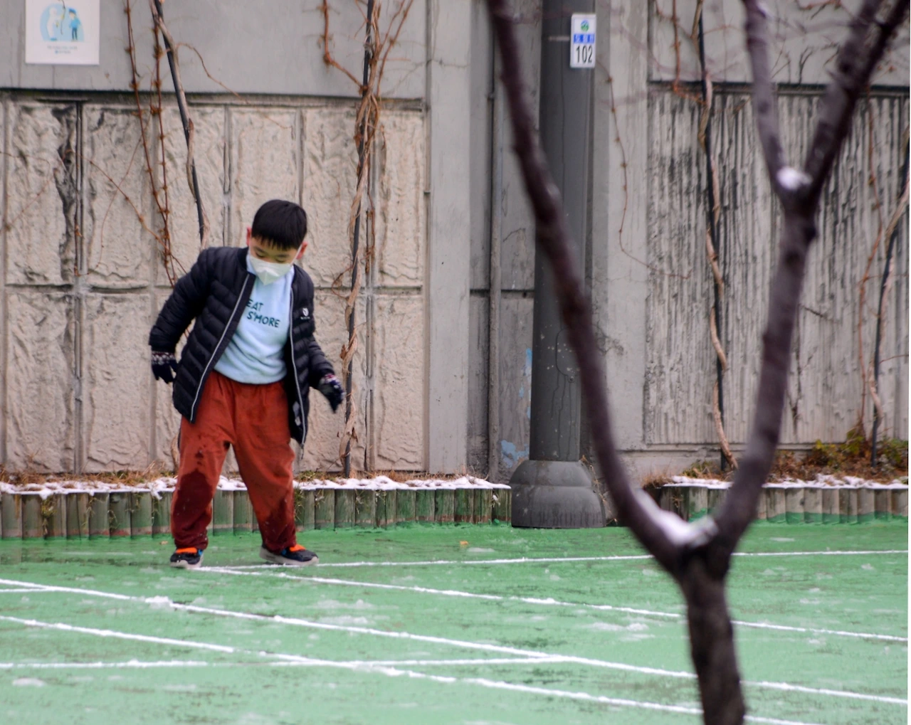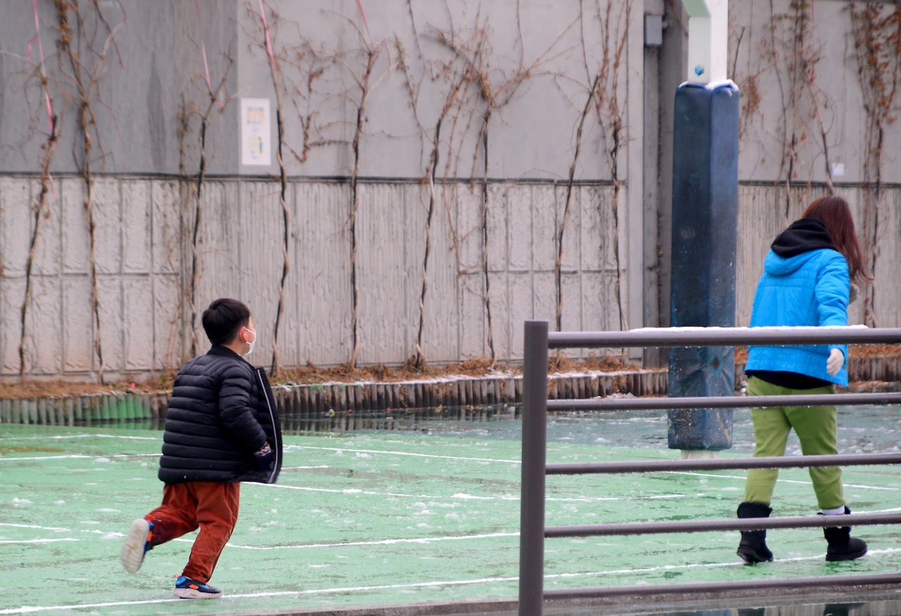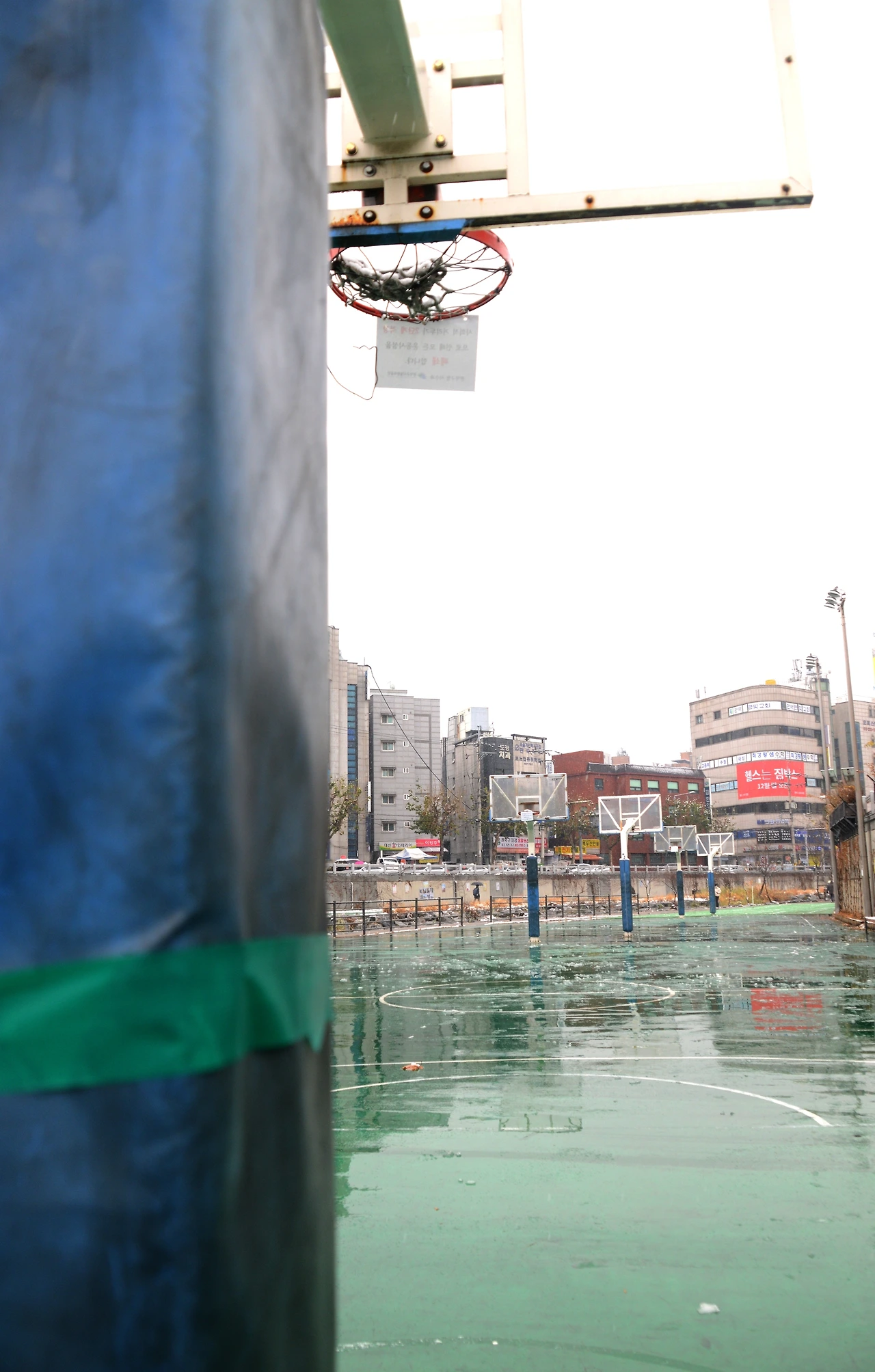보라매공원 농구코트와 함께 인기를 모았던 이 곳에 사람은 없다. 코트 위에 눈은 쌓이지 않고 전부 녹아 질퍽거린다. 이전에는 테이프로 감쌌는데 통행에 방해도 되는 까닭에 농구 골대를 막는 걸로 대처한 모양이다.