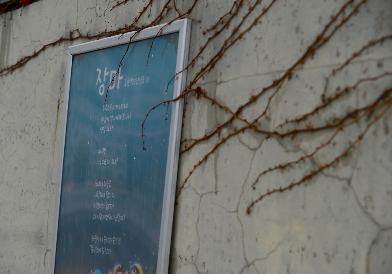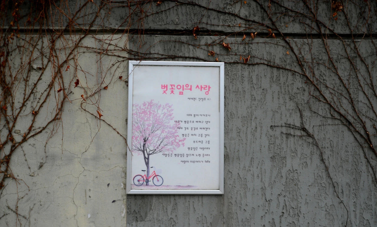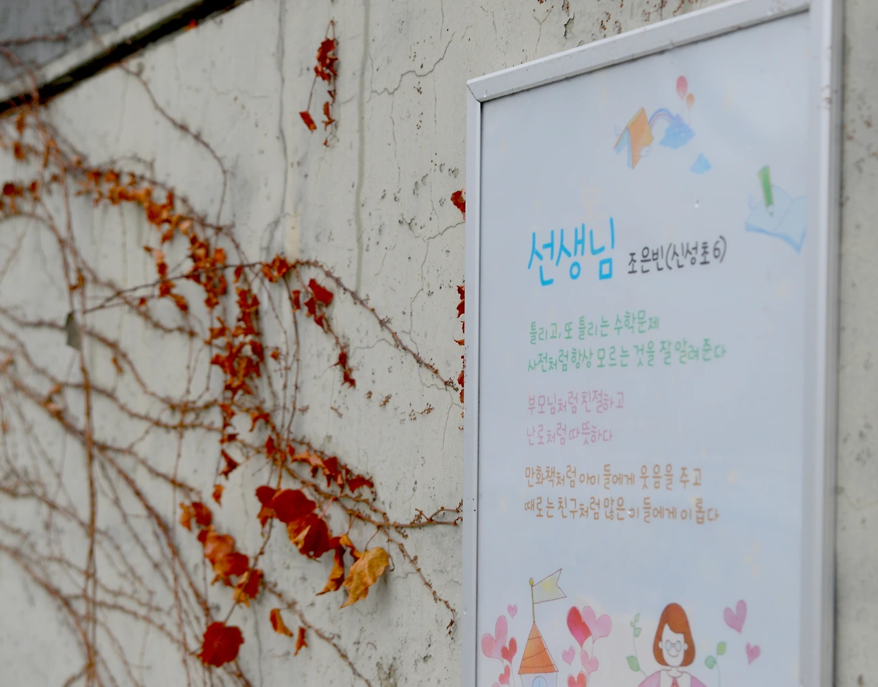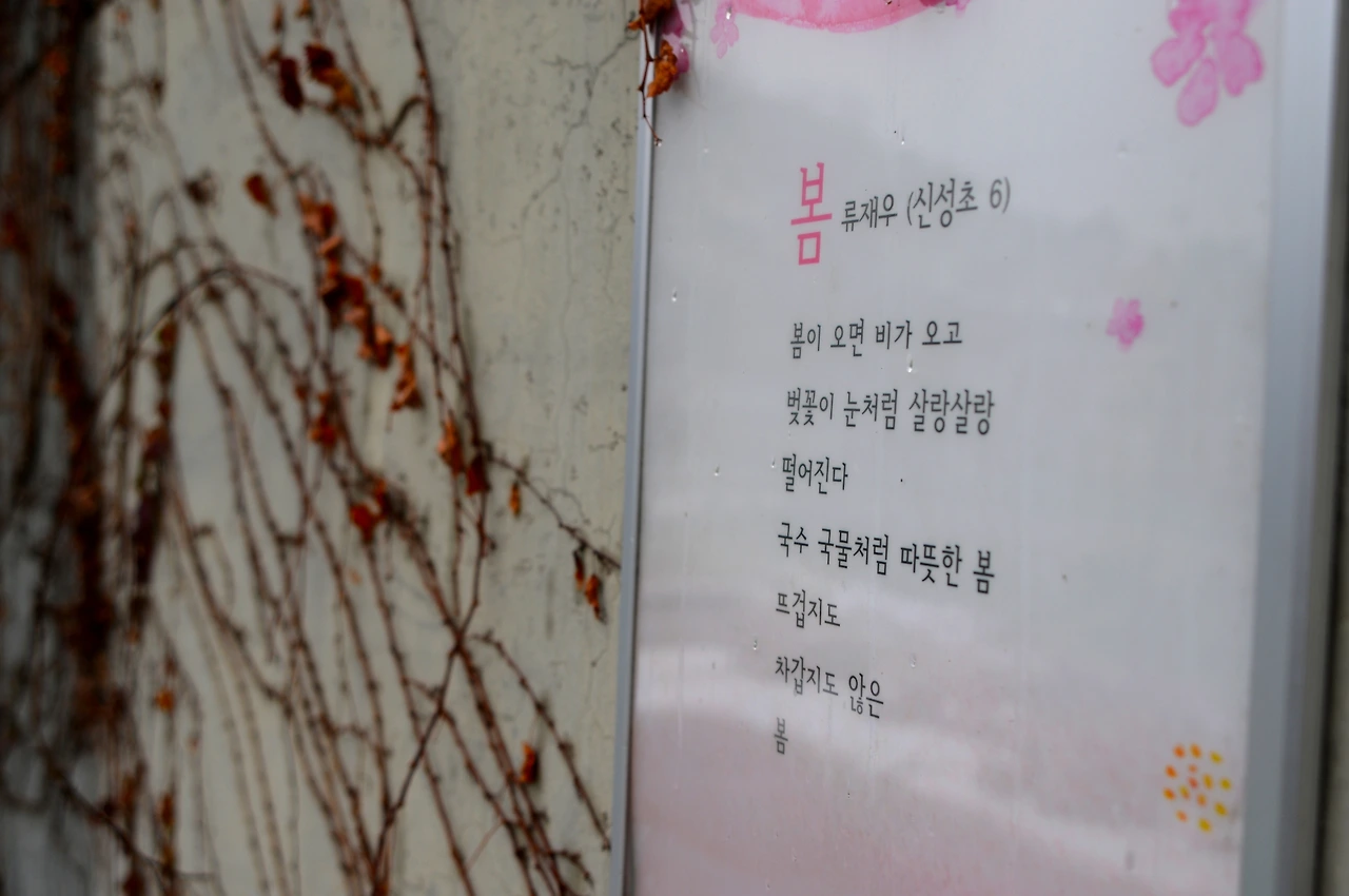 이런 풍경이 도림천을 따라 이어지니 감상적(?)이 되어 사소한 것에 집중하기 시작했다. 담쟁이덩쿨과 함께 놓인 학생의 작품을 눈여겨보는 식이다. <봄>, <벚꽃잎의 사랑>, <장마>, 그리고 <선생님> 등 평소 지나쳤을 작품인데 코로나 시대와 엮어 의미를 부여해본다.
