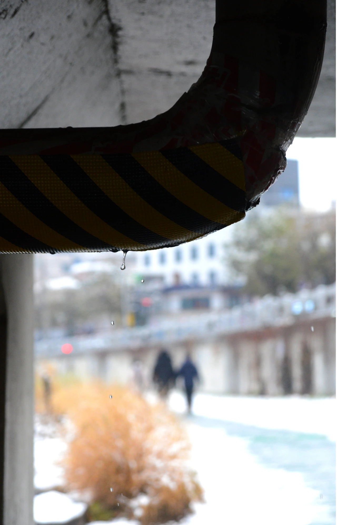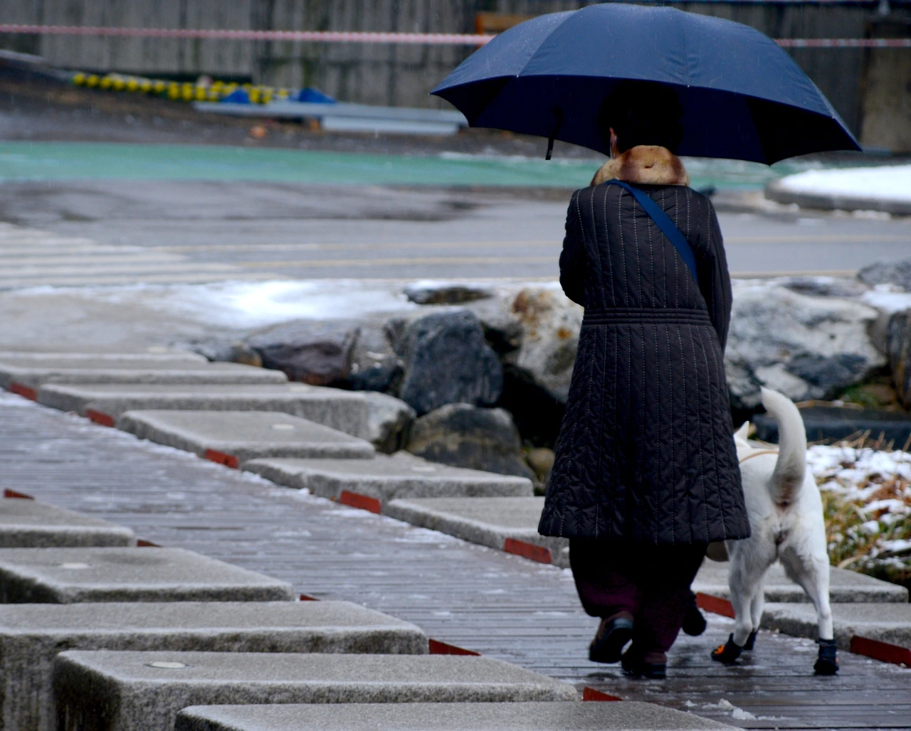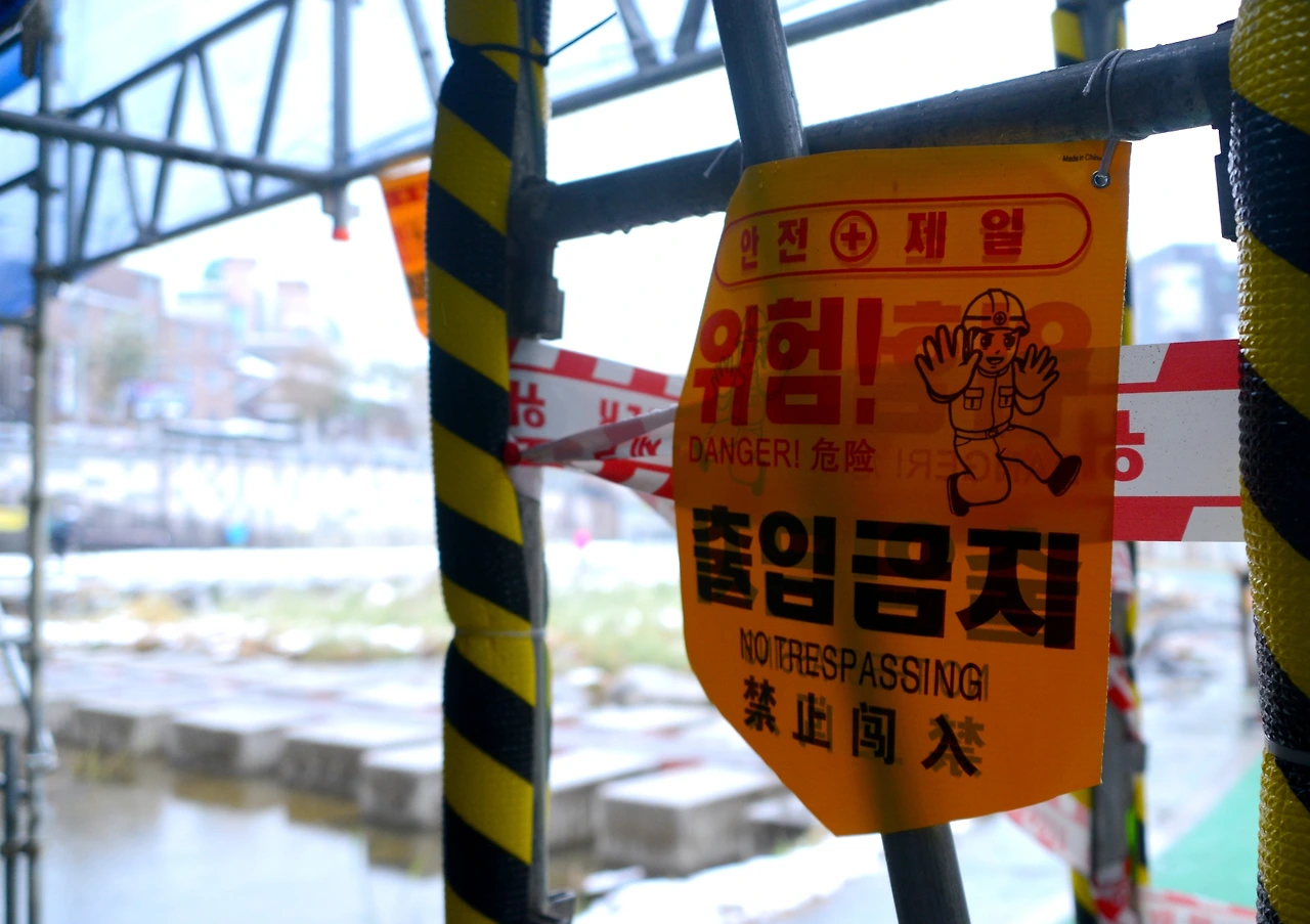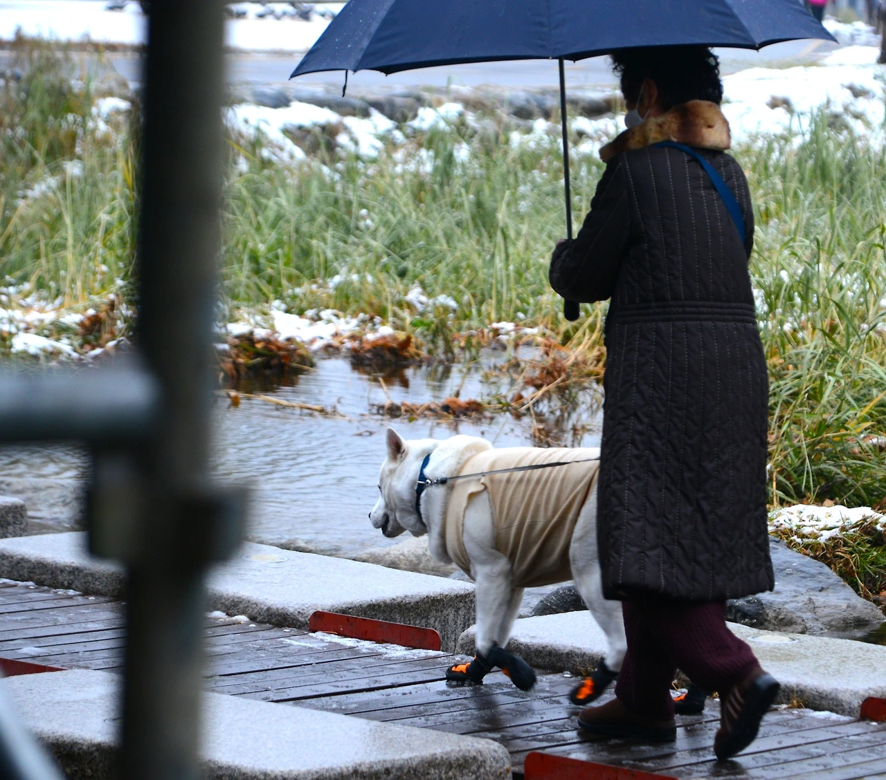 오가는 사람이 없어도 공사는 계속 진행된다. 다리의 유지, 보수 작업을 진행하고 있다. 마침 공사 현장 건너편에 아주머니 한 분이 반려동물과 함께 산책을 하고 있다. 매우 튼실해 보이는 강아지로 타이트한 옷과 앙증맞은 신발을 신고 있다.