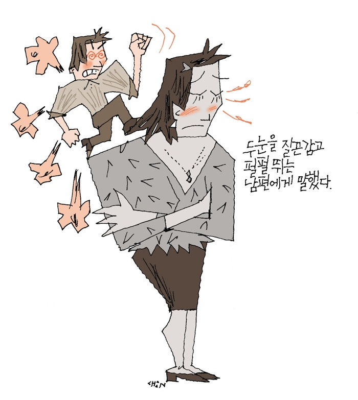 두 눈을 부라리며 펄펄 뛰는 남편을 향해