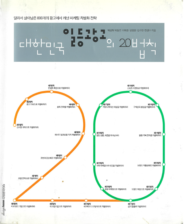 광고쟁이들에게 있어 가장 애증을 느끼는 단어는 아마도 ‘차별화’일 것입니다. 제품과 브랜드가 소비자로부터 선택되고 각인될 수 있도록 하는 것이 업의 본질이기 때문에 그렇습니다. 차별화를 오늘도 고민하는 광고 기획자로서 가장 먼저 추천하는 책이 있습니다. 바로 2004년 제일기획 프로들께서 쓰신 [대한민국 일등광고의 20법칙]입니다. 차별화에 대해 우리나라의 약 800여개 되는 광고 사례들을 20가지 주제로 엮어 놨습니다. 실제 사례위주의 내용이다 보니 광고 실무자가 보기에 매우 유용합니다. 지금도 공감하는 부분들이 많으면서 옛 광고들을 보는 재미도 있습니다.