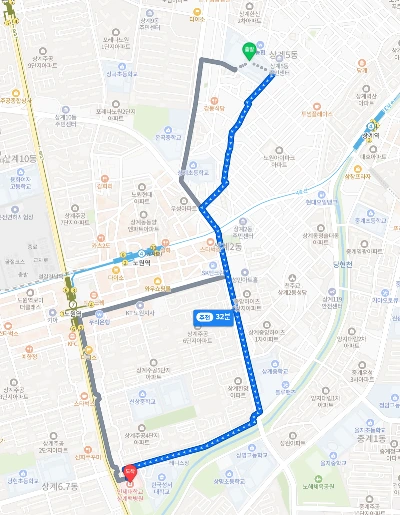 도착한 곳은 상계백병원이었다. 하필 어머니는 1~2일 전 교통사고를 당해 입원 중이셨다. 초등학교 2학년 짜리가 계상국민학교에서 병원까지 2km가 넘는 거리를 비를 맞으며 뛰어갔다니. 이 글을 쓰며 처음으로 지도를 찍어보고는 헛웃음이 절로 났다. 순간 만화 주인공 병에 단단히 걸렸던 게 틀림없다.
