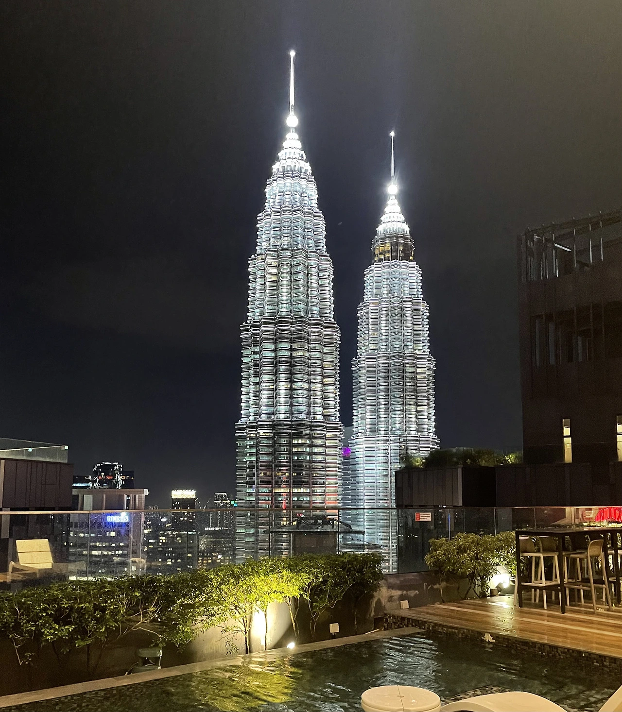 떠나기 전 마지막 밤이라 숙소에 있는 야외수영장에 수영을 하러 갔다. 고층 수영장에 들어서자, 난간 아래 빼곡히 펼쳐지는 마천루의 향연이 마치 말레이시아가 자신의 기술 성장을 맘껏 뽐내고 있는 듯했다. 그 와중 바로 눈앞에서 거대하게 반짝이며 서 있는 페트로나스트윈빌딩은 가까이 있기도 했지만 높이와 크기가 압도적으로 커 문득 공간감이 사라지며 오묘한 기분마저 들게 했다.