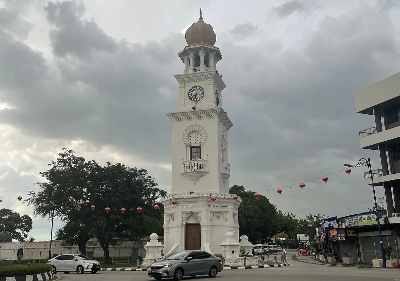 좀 더 걸어가면 커다란 시계탑도 구경거리다. 1897년 영국 빅토리아 여왕 즉위 60주년을 기념해 건립된 것으로 한 부유한 지역 상인의 기부로 제작됐다 한다. 시계탑이 약간 기울어져 있어 페낭의 피사의 사탑이라는 별칭도 있다고 하는데 2차 세계대전 중 일본군의 폭격 여파라 한다.