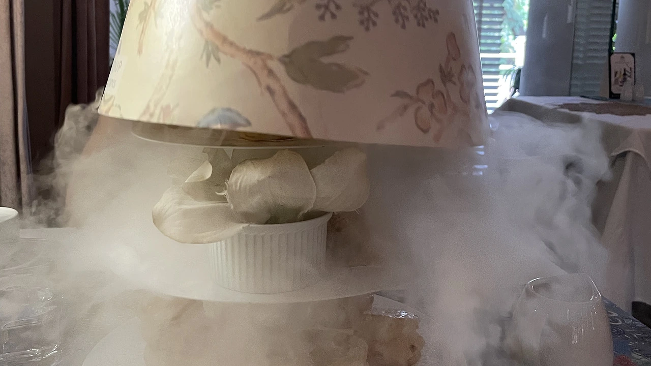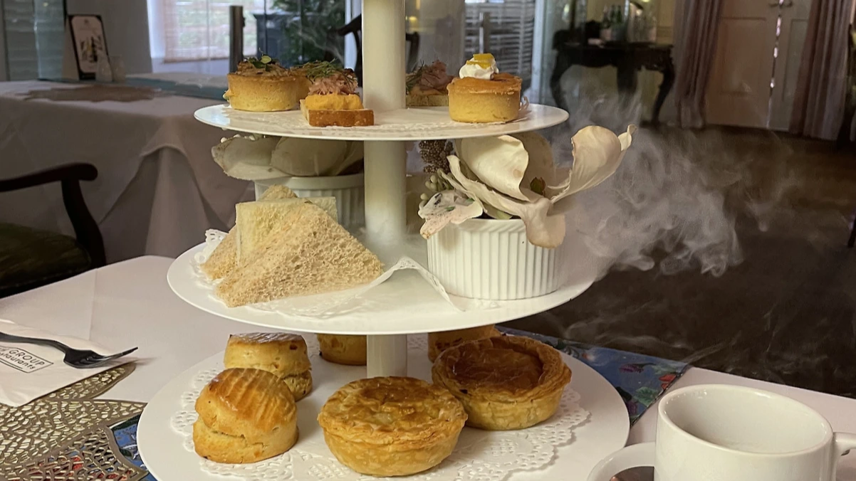 티가 나온 후 이어서 기다란 고깔 모양의 예쁜 뚜껑으로 덮인 애프터눈티 간식이 등장했다. 직원 분이 뚜껑을 여니 연기가 자욱이 새어 나오며 다소 요란하게 음식이 등장했다. 샌드위치부터 스콘, 브라우니 등. 보기만 해도 배불렀던 우리는 남기면 싸가자며 하나씩 맛보기 시작했다.(결국 몇 개 싸왔다.)