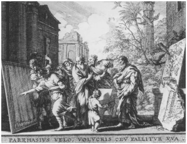 유명한 일화도 있다. 플라톤의 저작에도 그 이름이 보이는 그리스의 화가 제욱시스(Zeuxis)와 파라시오스(Parasios)는 당대의 라이벌이었다. 두 사람이 솜씨를 겨루는데, 제욱시스가 그림 막을 들추자 탐스러운 포도넝쿨에 지나던 새들이 와서 부딪혔다. 제욱시스가 파라시오스에게 다가가 이제 그림 막을 들추라 하자, 파라시오스는 말했다. “그 막이 내가 그린 그림일세.” 승리는 동료의 눈까지 속인 파리시오스에게 돌아갔다.
