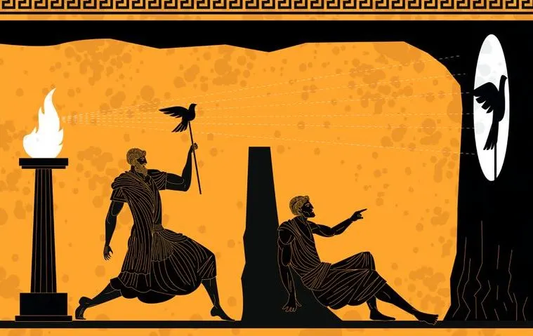 플라톤은 진짜를 보지 못하는 인간 존재를 동굴 속에 사는 죄수로 비유했다. 동굴 속에 묶여 사는 인간은 동굴 밖의 태양빛을 알지 못한다. 다만 눈앞의 동굴 벽면을 세계로 알고, 동굴 안으로 스며든 빛줄기에 비친 그림자를 보며, 허상을 실제로 착각할 뿐이다.