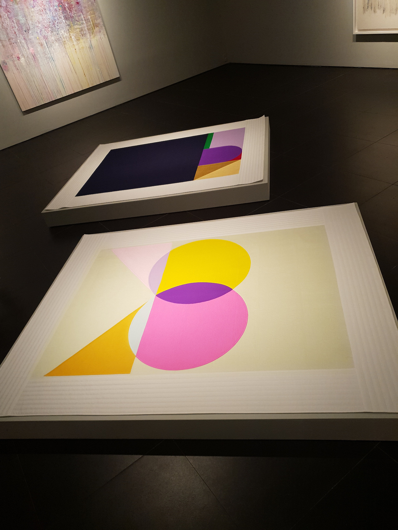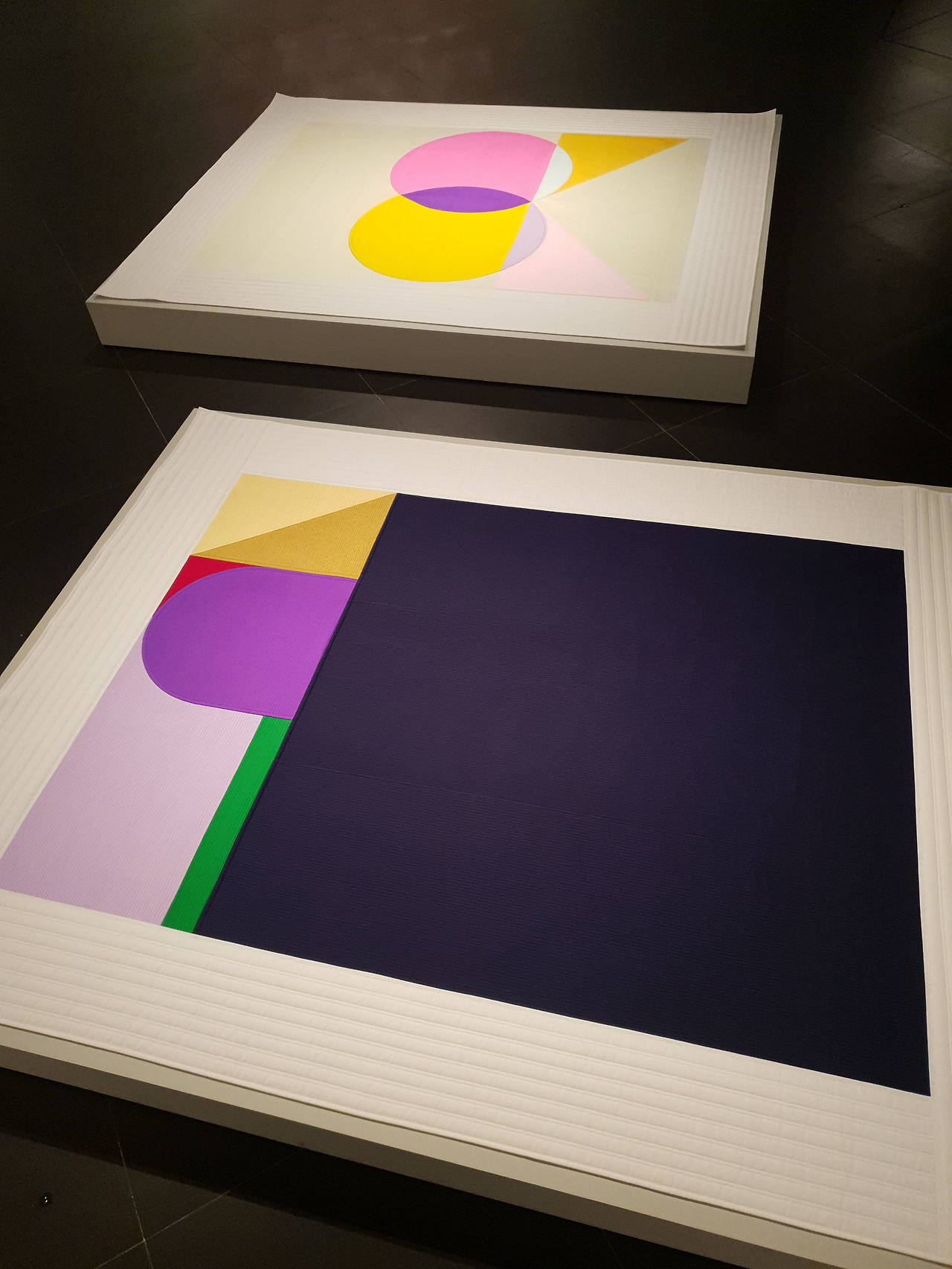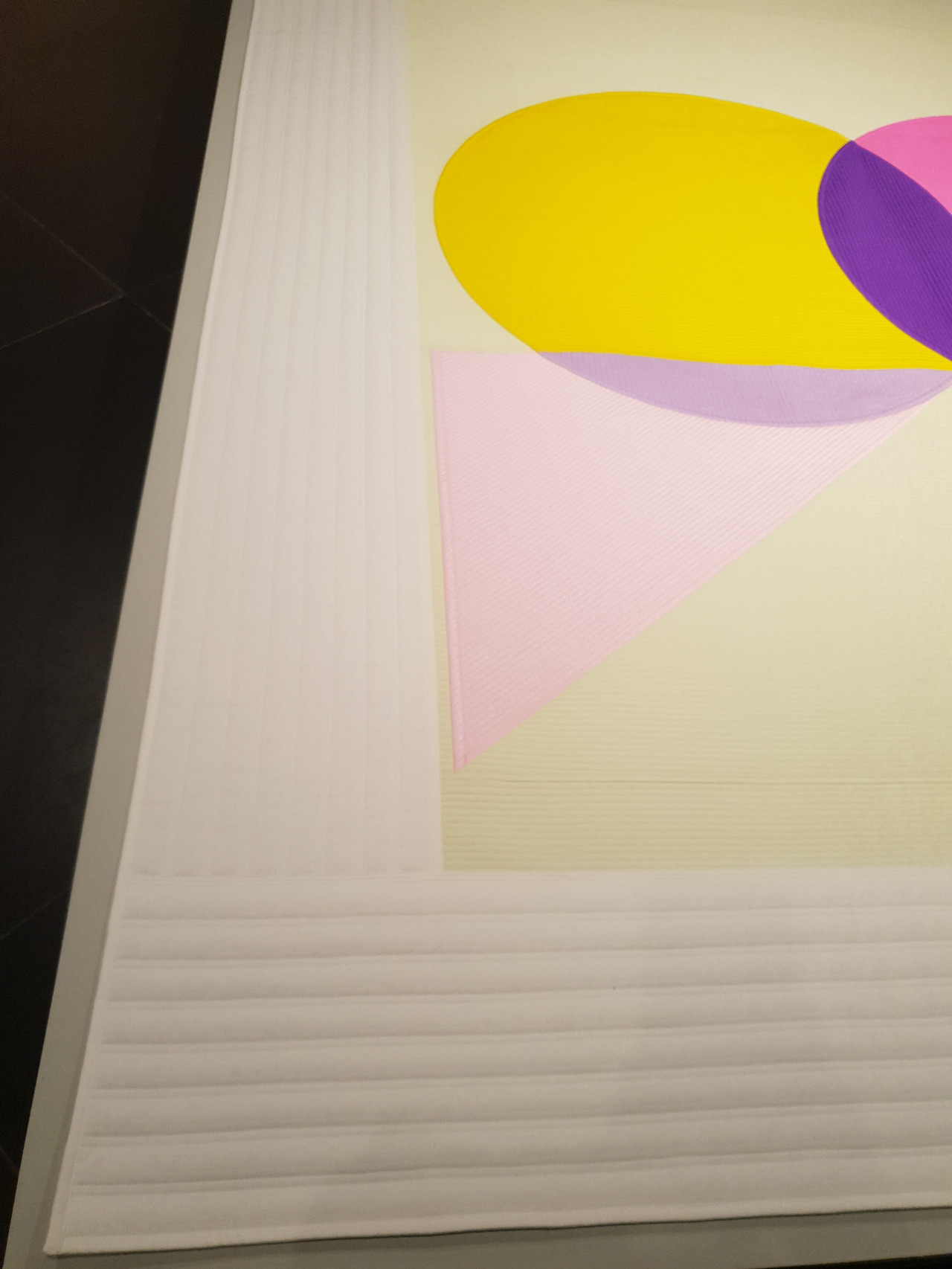 갤러리현대 《50주년》 특별전 전경눈길이 아닌 발목을 잡아끄는 작품부터 보자면, 작품명 〈U:나비의 꿈〉, 〈U:쥐 죽은 듯〉이다. 맨바닥에 깔려 관객에게 긴장감을 줄 수 있다면 더 좋았겠지만, 좌대 위에 깔렸으니(안전바가 없는 게 어딘가!), 명백히 ‘나 예술품이에요’하는 작품이다. 벽에 붙었어도 나쁘지 않았겠다. 캔버스를 닮아 평평하고, 색면회화를 닮았으며, 작품명에서 보듯 서사가 있으니, 벽에 걸렸다면 언뜻 모더니즘 정점의 추상회화로도 보였을 작품이다. 하지만 모더니즘을 위반한 포스트모더니즘 작품이다. 오브제인데, 게다가 이불이라는 구체적 공예품이다.