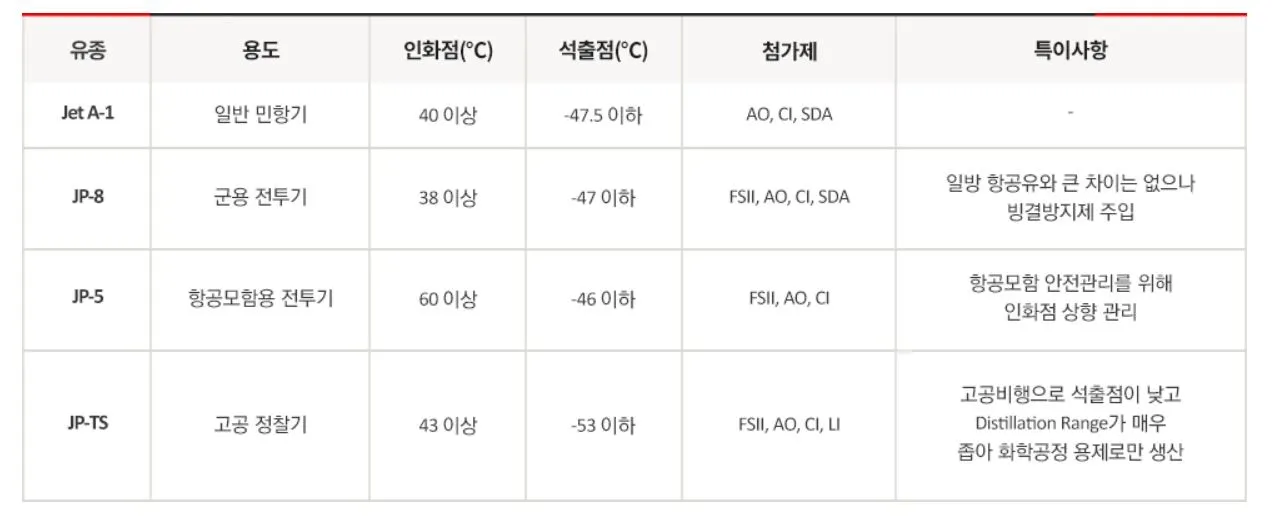 비행기는 엔진 가동 시 압축된 공기를 사용하므로 폭발의 위험이 크고 반대로 연료가 제대로 연소하지 않으면 비행 중 고장이 날 수도 있고, 사고 발생 시 인명 피해로 이어지기에 안전을 위해 저온 안전성 등 30개 항목에 대한 품질 규격 관리는 매우 까다롭다.