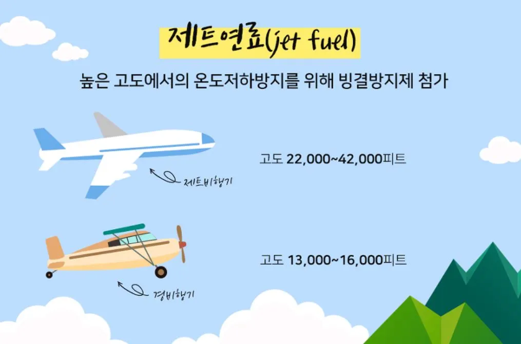 지상의 자동차와 환경이 다른 하늘을 날아다니는 비행기의 연료는 높은 고도의 낮은 기압과 온도 변화에 대응하기 위해서 산화방지제, 부식방지제, 정전기 방지제, 빙결방지제, 윤활성 향상제 등과 같은 여러 첨가제가 들어간다.