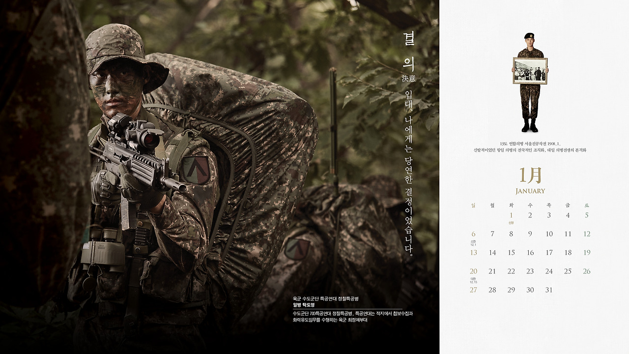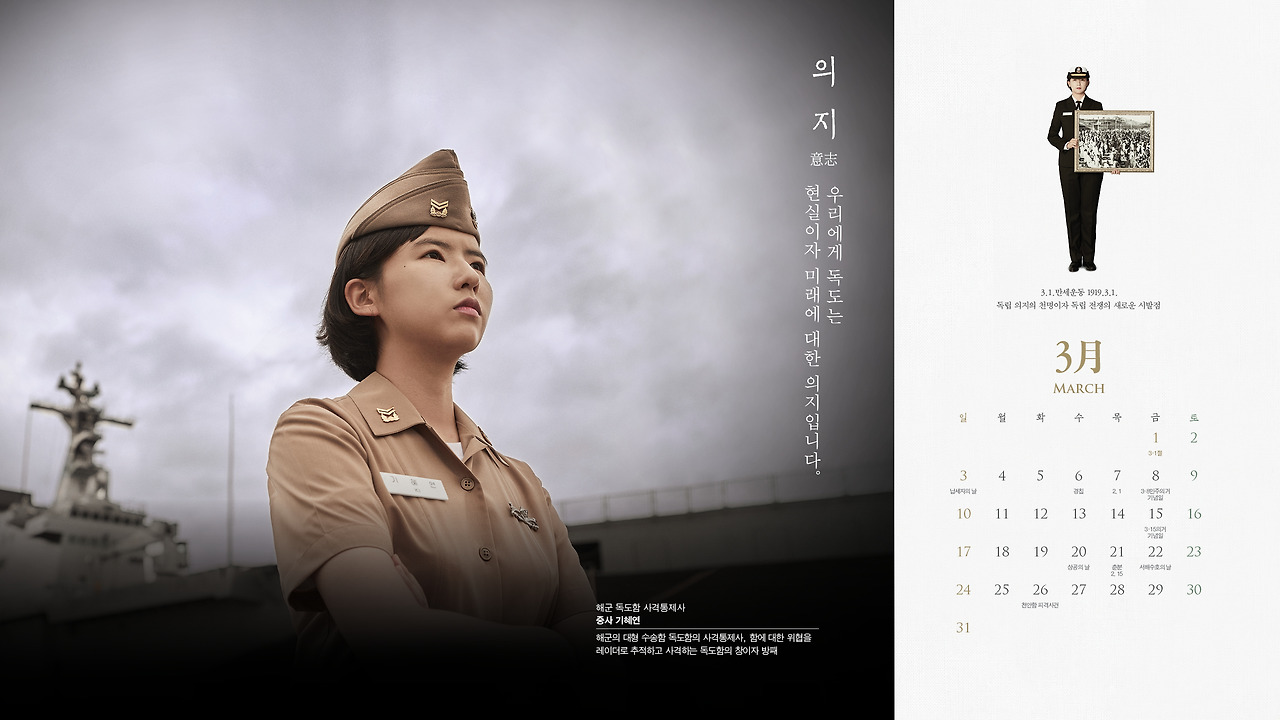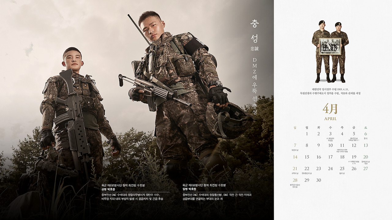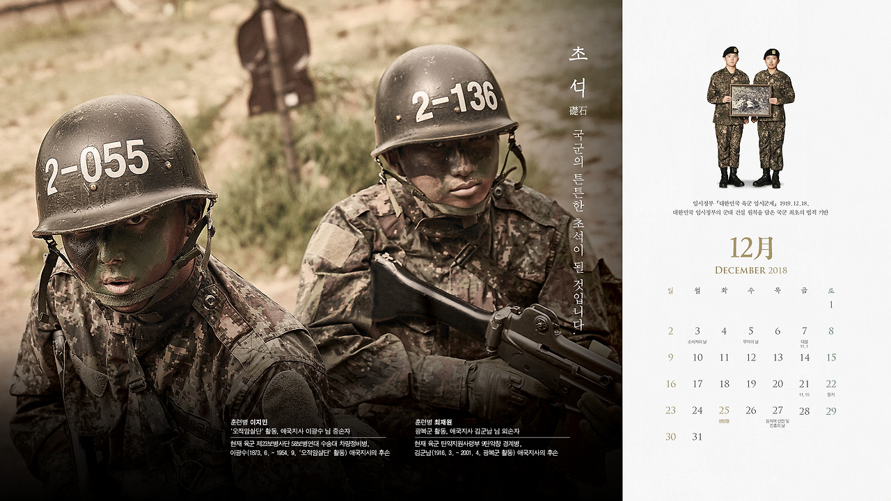 대한민국 임시정부 수립 100주년을 기념하며, 특별하게 제작된 2019년 대한민국 국방부 달력 '국군, 닮음을 담다'에 담긴 사진들은 국군의 뿌리를 찾아, 독립전쟁의 영웅을 닮은 우리 국군장병의 모습을 담고 있다.