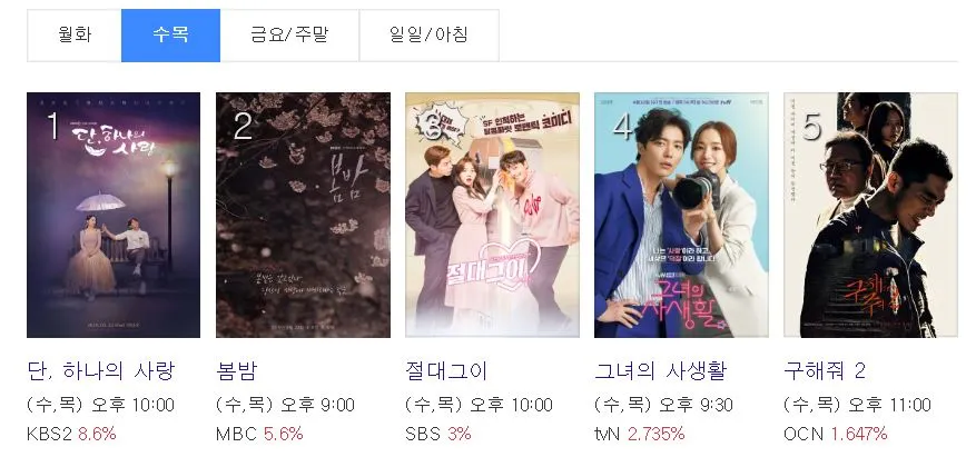 안방극장을 판타지 로맨스 마법으로 물들이고 있는 ‘단, 하나의 사랑’의 시청률은 천사 날개를 펼쳐 이연서를 구하는 단의 엔딩 장면이 최고 시청률 11.7%를 기록했으며, 시청률은 AGB닐슨 수도권 기준으로 1회 7.7%, 2회는 9.5%, 3회 7.5%, 4회 8.9%로서 정해인/한지민 출연으로 기대를 받은 동 시간 대 경쟁작품인 MBC '봄밤'을 누르고 수목 드라마의 왕좌를 차지했다.